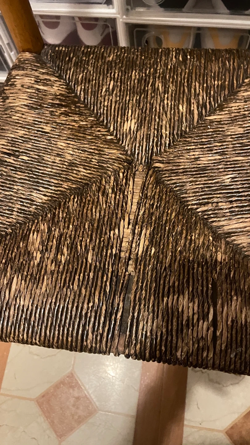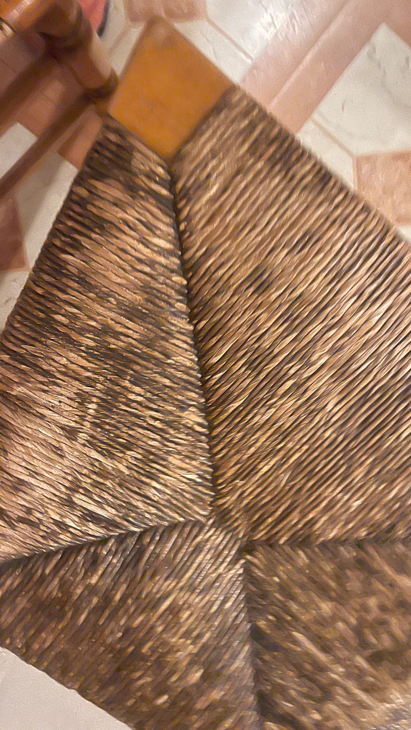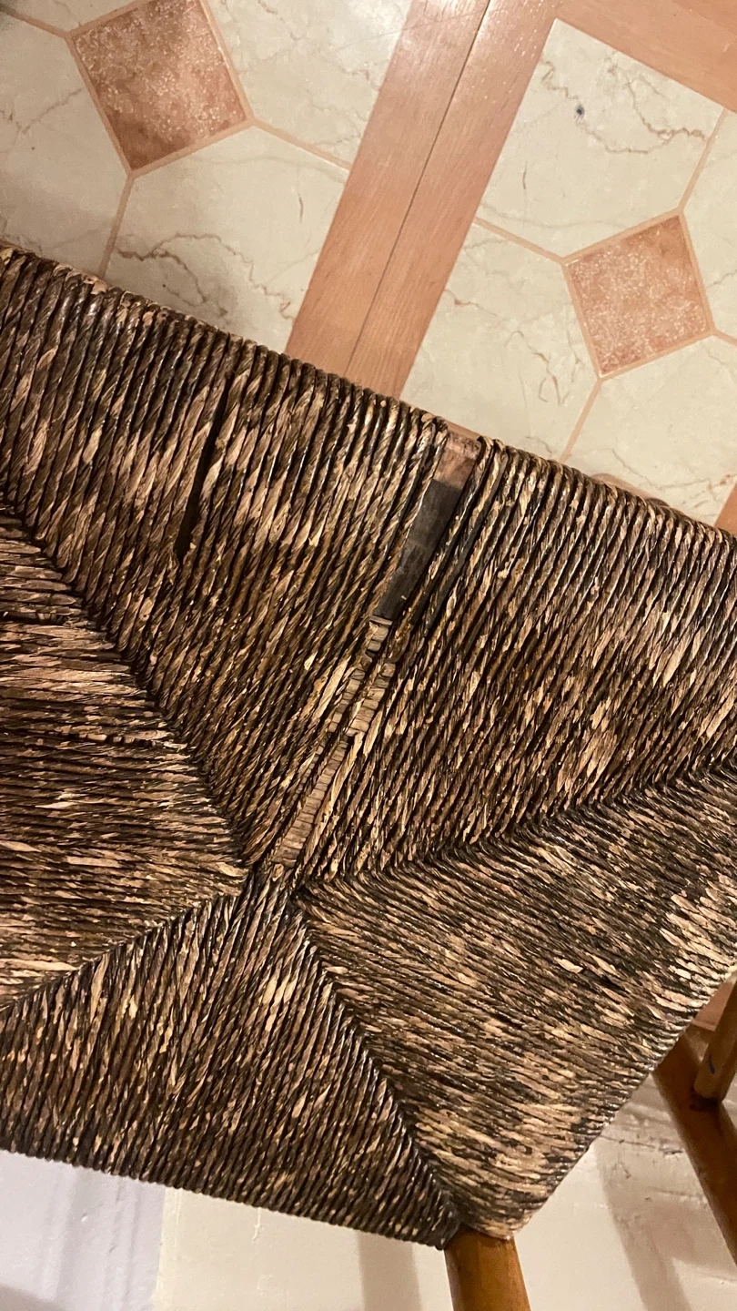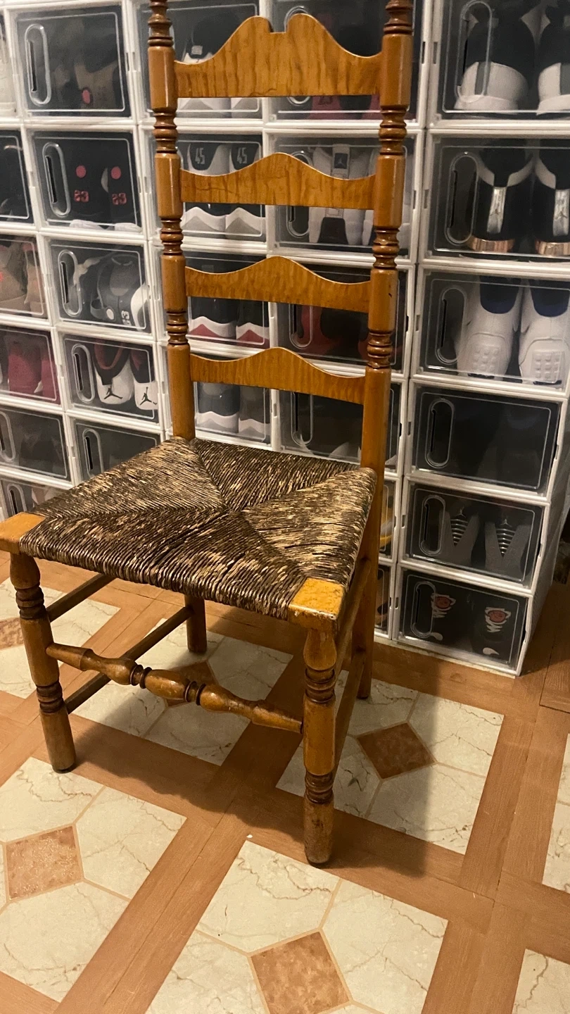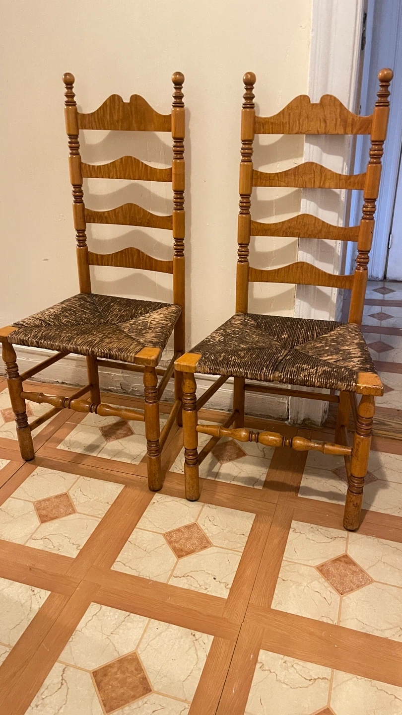 Selling a wooden ladderback chair featuring a woven seat. The chair has a classic design and would be a great addition to any home. There are some signs of use on the seat.