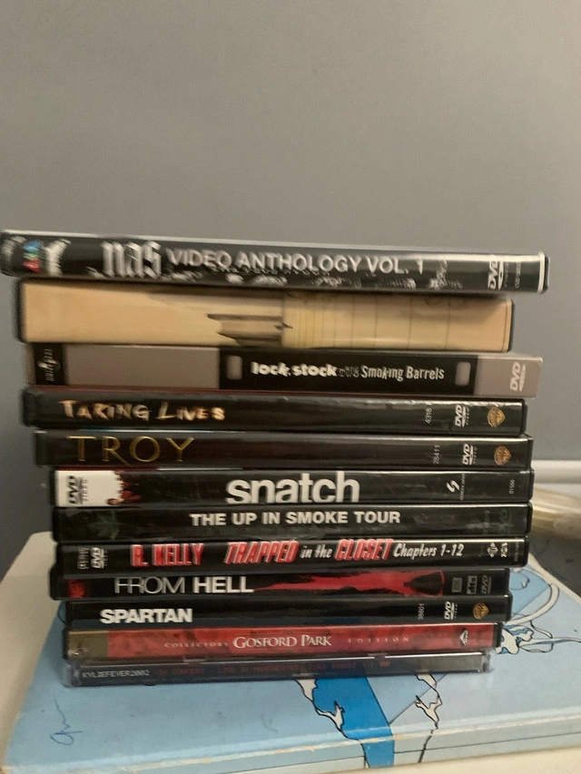 For sale is a collection of used DVDs, featuring titles such as Nas Video Anthology Vol. 1, Lock Stock and Two Smoking Barrels, Taking Lives, Troy, Snatch, The Up in Smoke Tour, R. Kelly Trapped in the Closet Chapters 1-12, From Hell, Spartan, and Gosford Park Collector's Edition. All DVDs are in good condition and ready for your viewing pleasure. Add a touch of cinematic flair to your collection! If the ad's up, the movies are ready to roll!