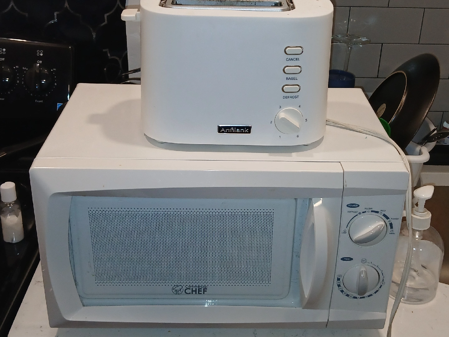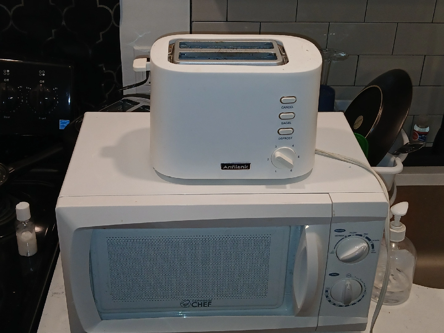 Selling a microwave and toaster oven combo. Both are white and in good working condition. The toaster is an Anflank brand and the microwave is a Chef brand