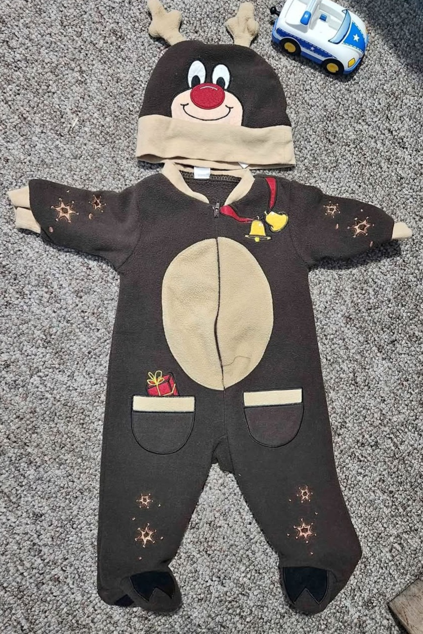 Super cute reindeer onesie with matching hat! It's in great condition and ready for a new home. Perfect for keeping your little one warm, cozy for teick or treat, also as festive Xmas wear