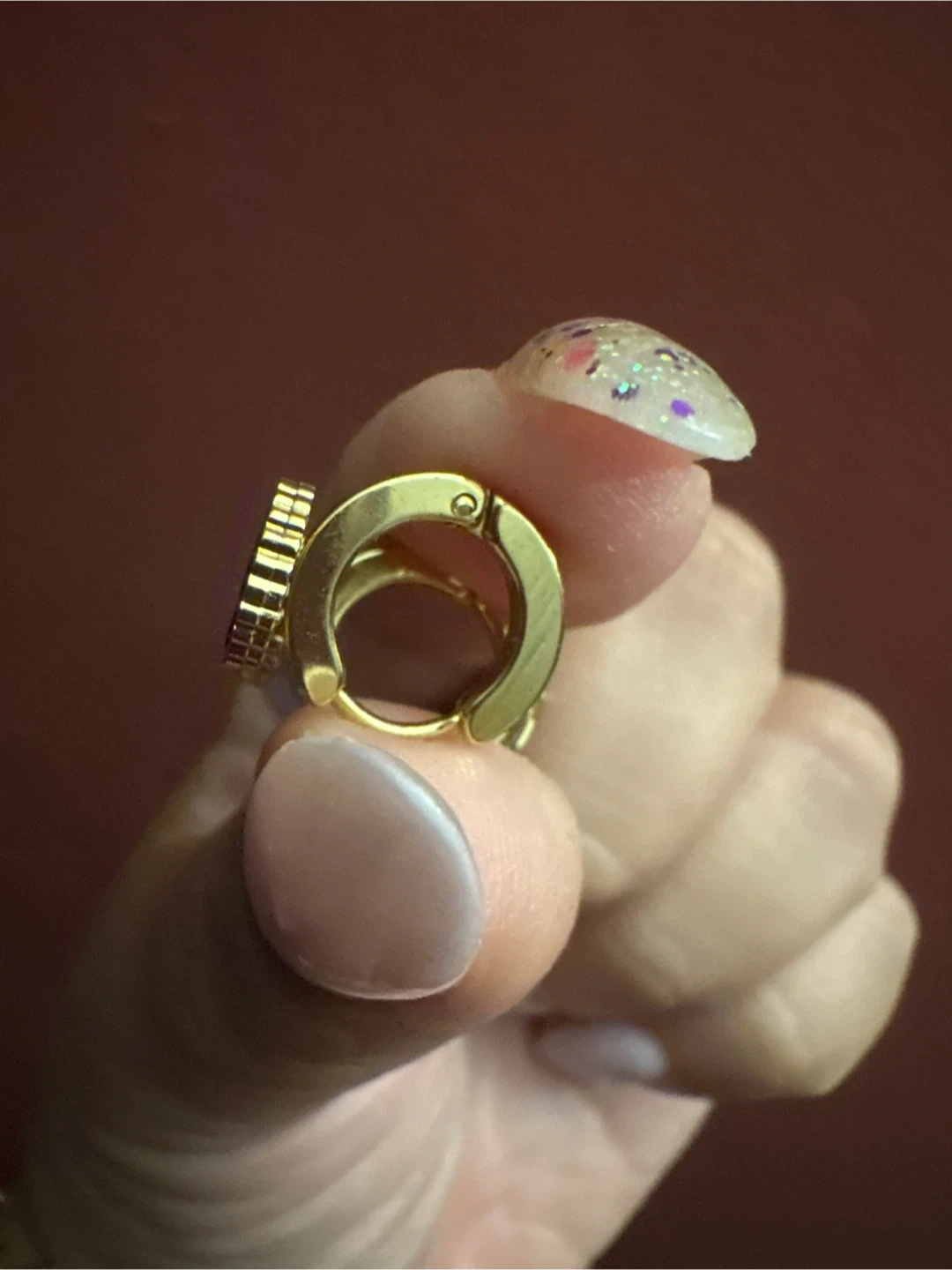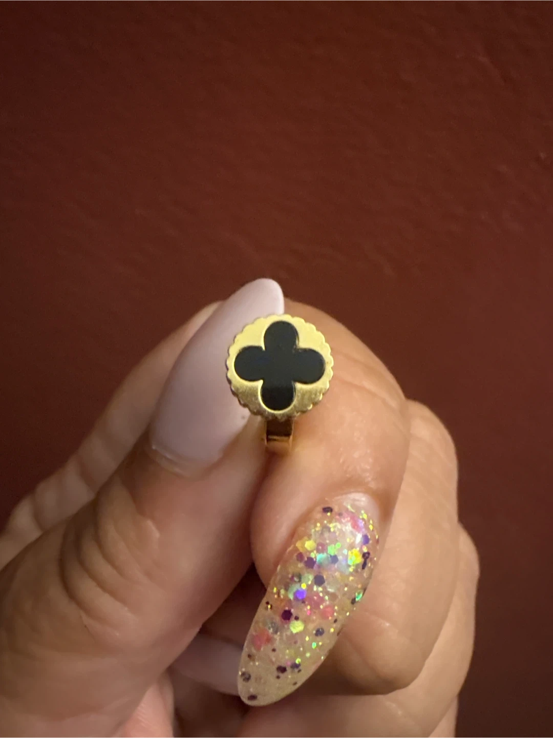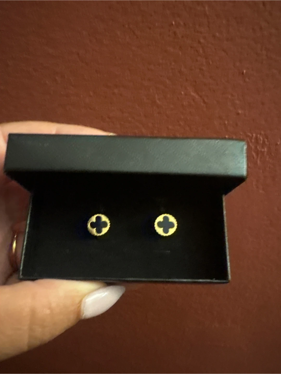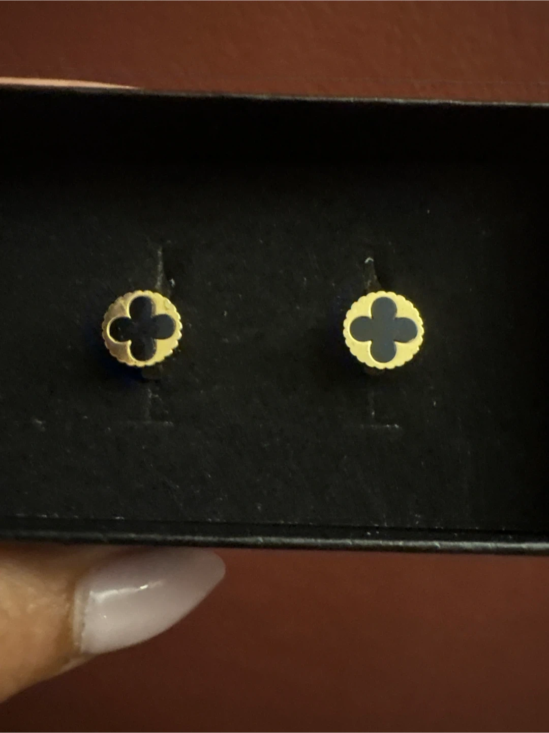 Selling a pair of 18 K gold Stainless steel onyx Alhambra earrings in gold with a black clover design. They are in excellent condition and come with the original Box