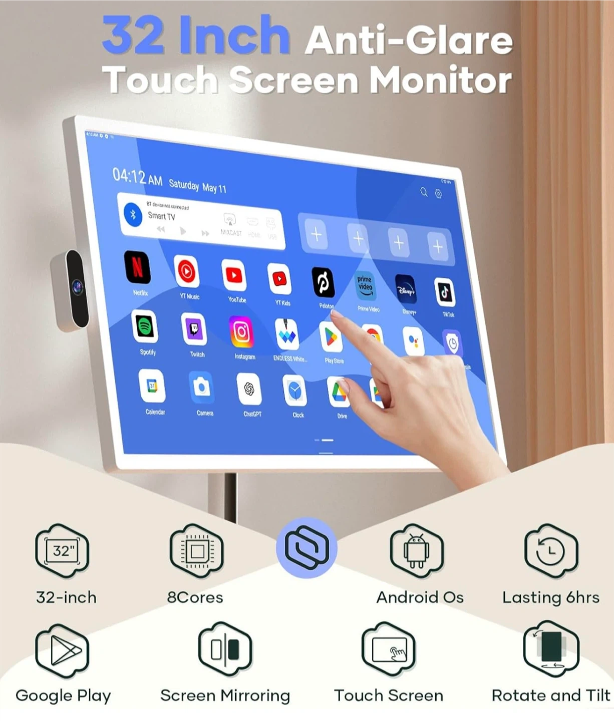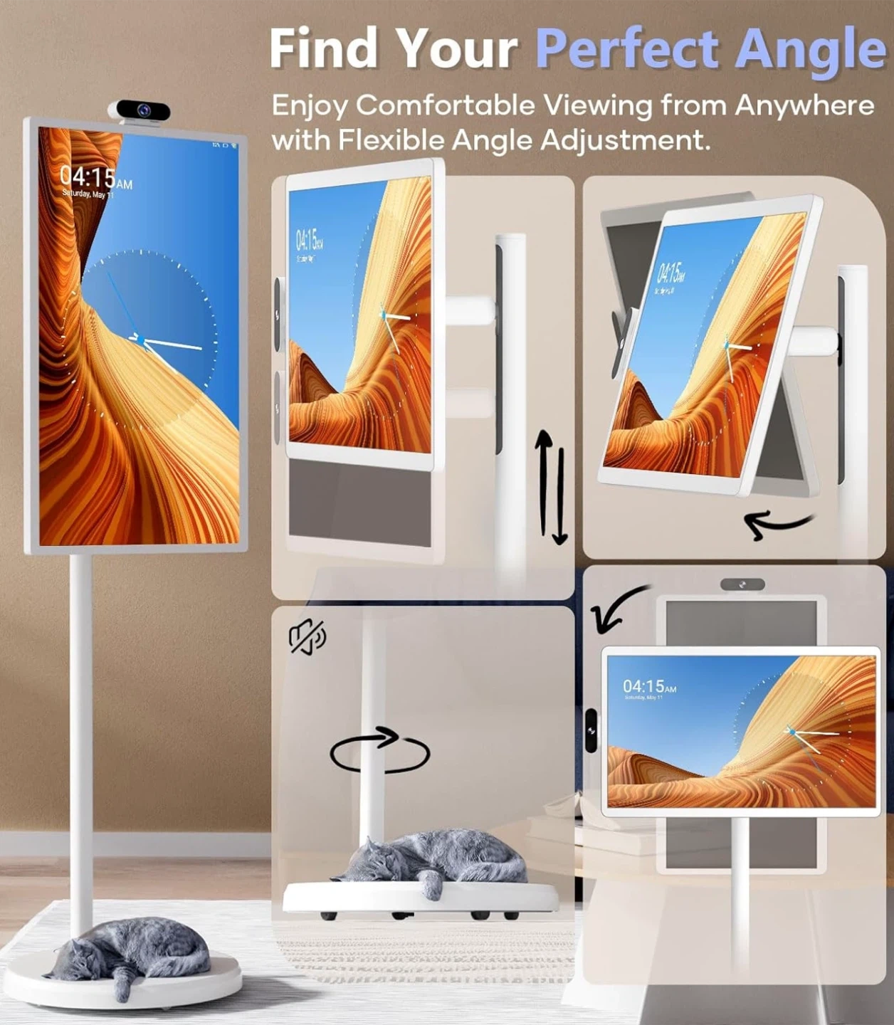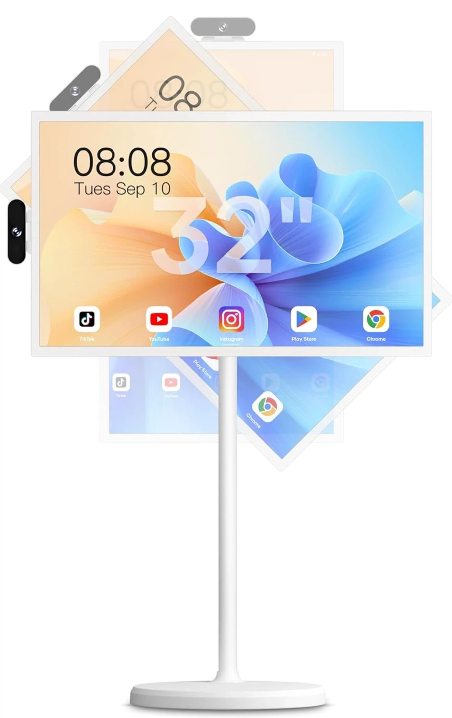 32 Inch Mobile Portable TV Stand on Wheels Support Google Store Full Swivel Rotation Portable Touch Screen Monitor Built-in Battery Smart Rolling Tablet TV 4K Camera Remote Control White