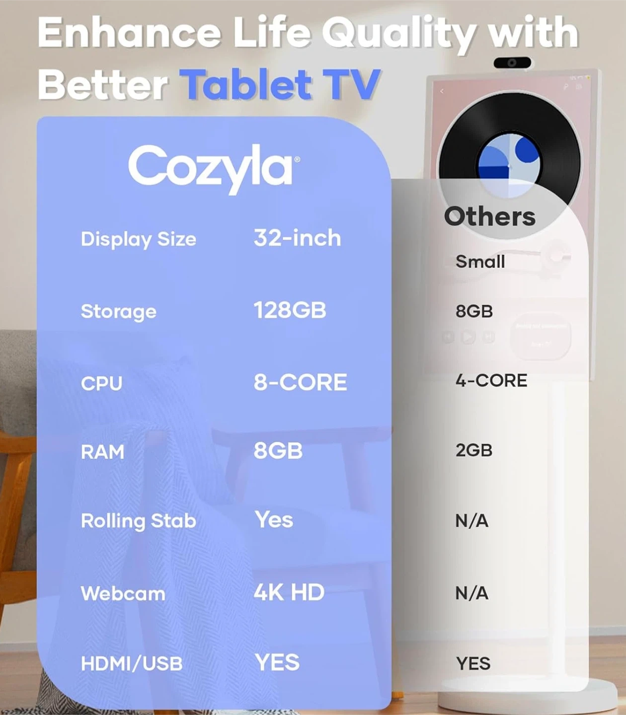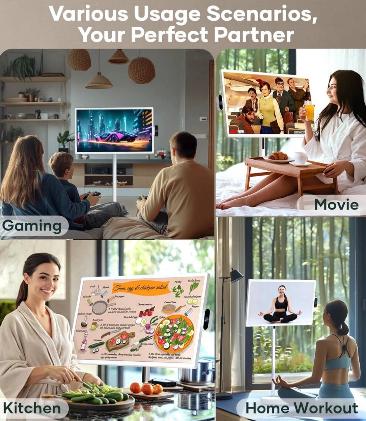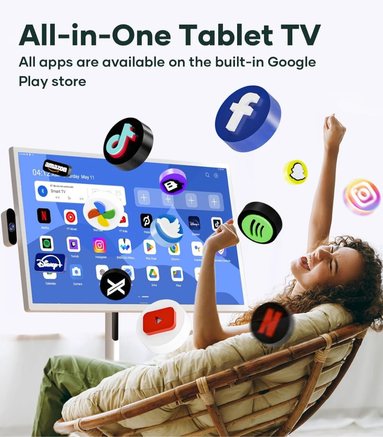 32 Inch Mobile Portable TV Stand on Wheels Support Google Store Full Swivel Rotation Portable Touch Screen Monitor Built-in Battery Smart Rolling Tablet TV 4K Camera Remote Control White