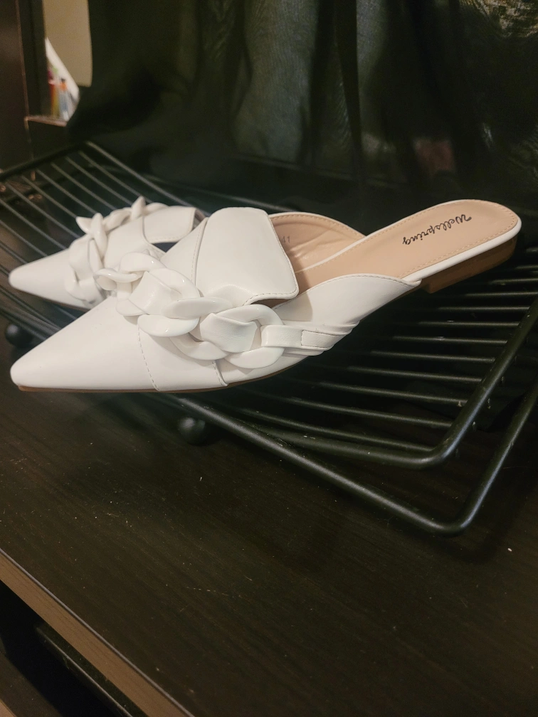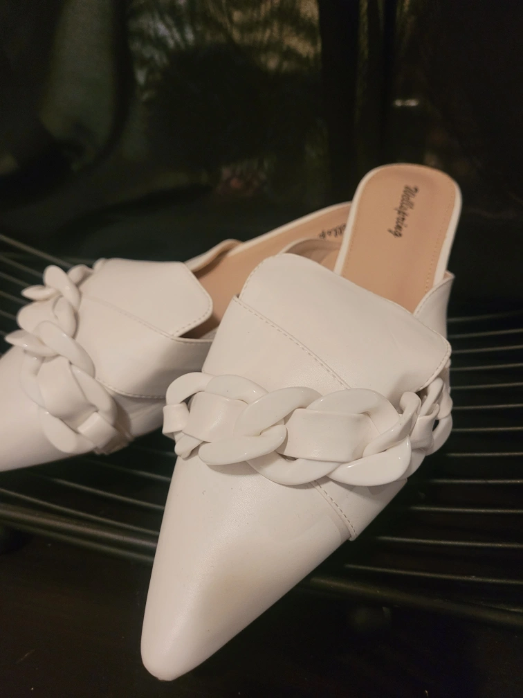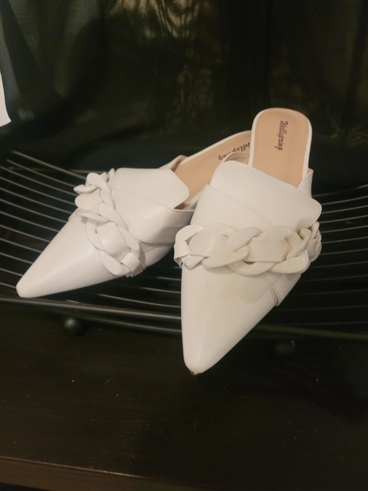These are a pair of white mules from the brand Wellspring. They are a size 8 and feature a decorative chain detail across the top. These mules are perfect for adding a touch of elegance to any outfit, whether you're dressing up for a night out or just running errands around town