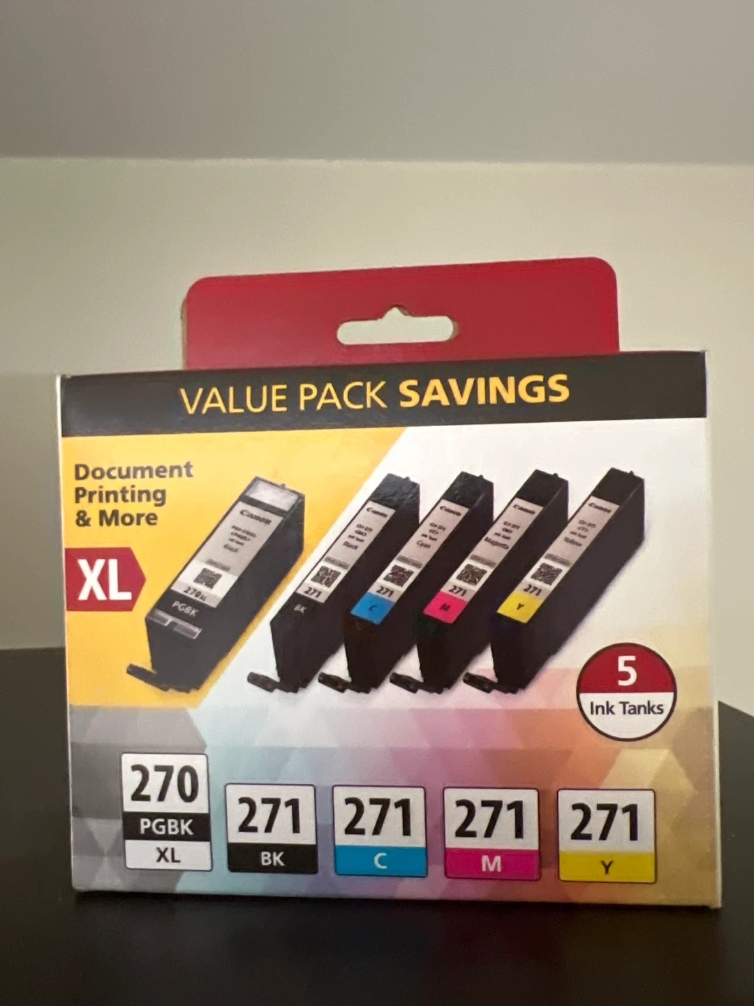 Selling a brand new Canon 270/271 ink cartridge value pack. It includes 5 ink tanks: 270 PGBK XL, 271 BK (Black), 271 C (Cyan), 271 M (Magenta), and 271 Y (Yellow). Great for document printing and more!