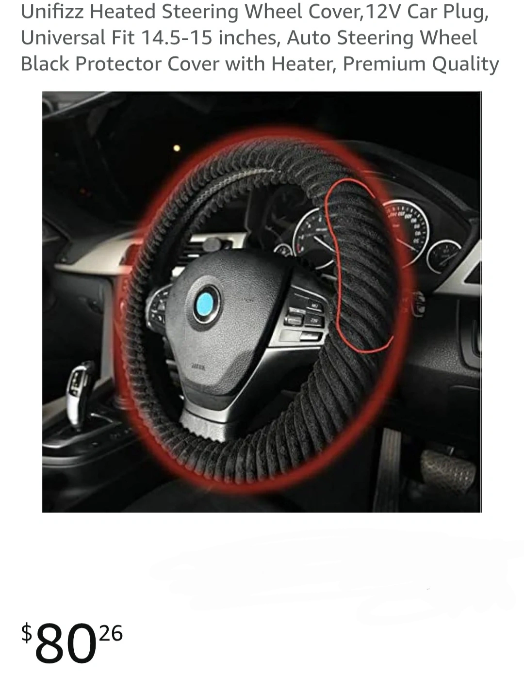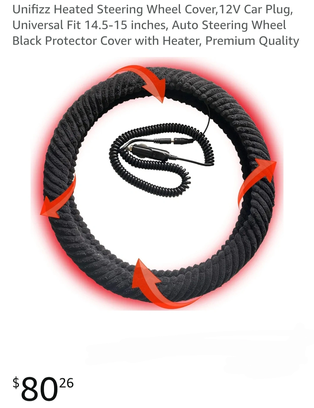Keep your hands warm this winter with a Unifizz heated steering wheel cover! This cover fits steering wheels that are 14.5-15 inches. It comes with a 12V car plug and is a universal fit. Originally bought for $80.26
