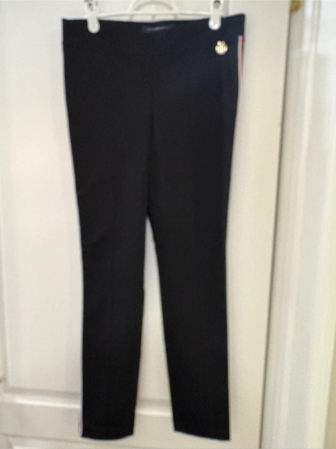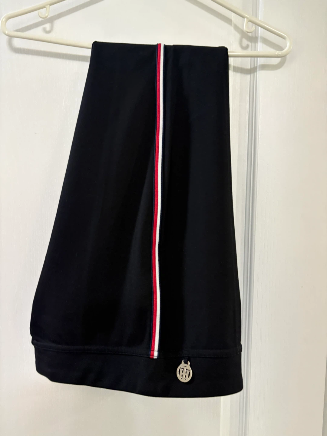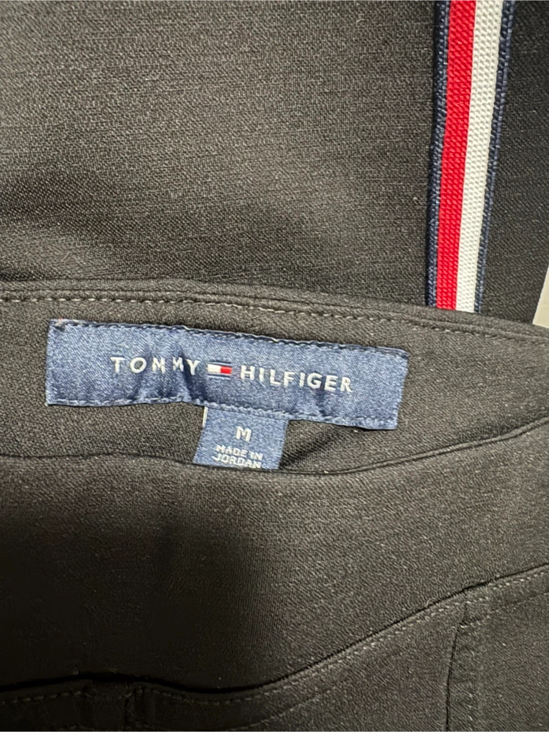 Tommy Hilfiger black pants in size medium. These stylish pants feature a red, white, and blue stripe down the side and the Tommy Hilfiger logo. Great for a casual or dressed-up look!