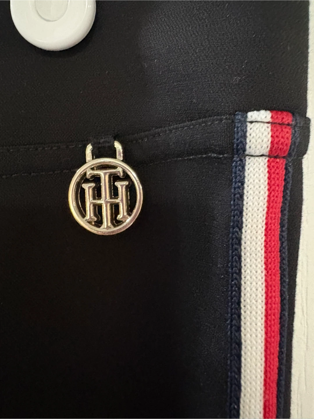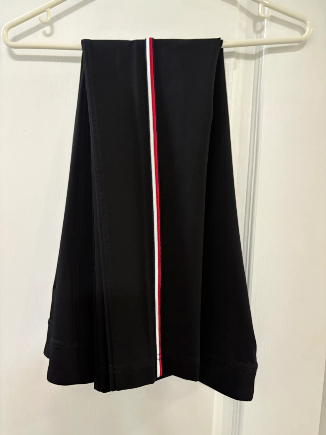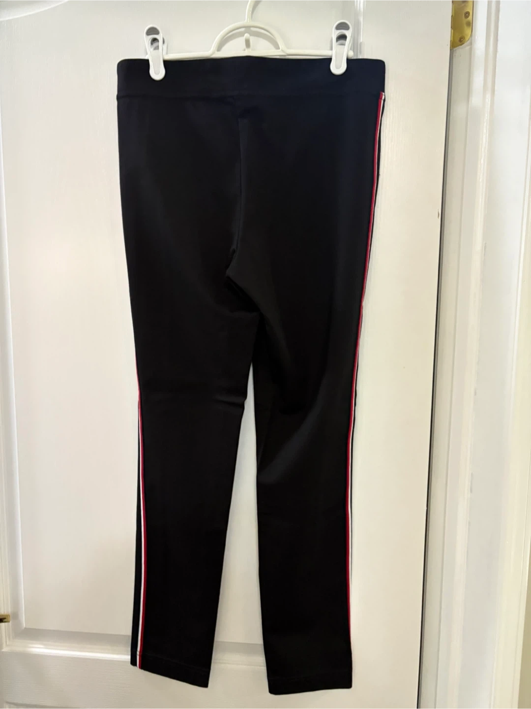 Tommy Hilfiger black pants in size medium. These stylish pants feature a red, white, and blue stripe down the side and the Tommy Hilfiger logo. Great for a casual or dressed-up look!
