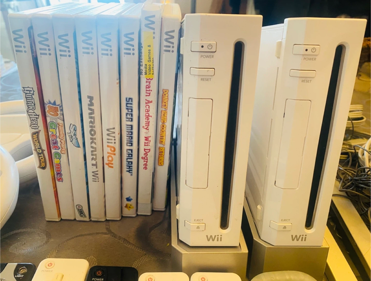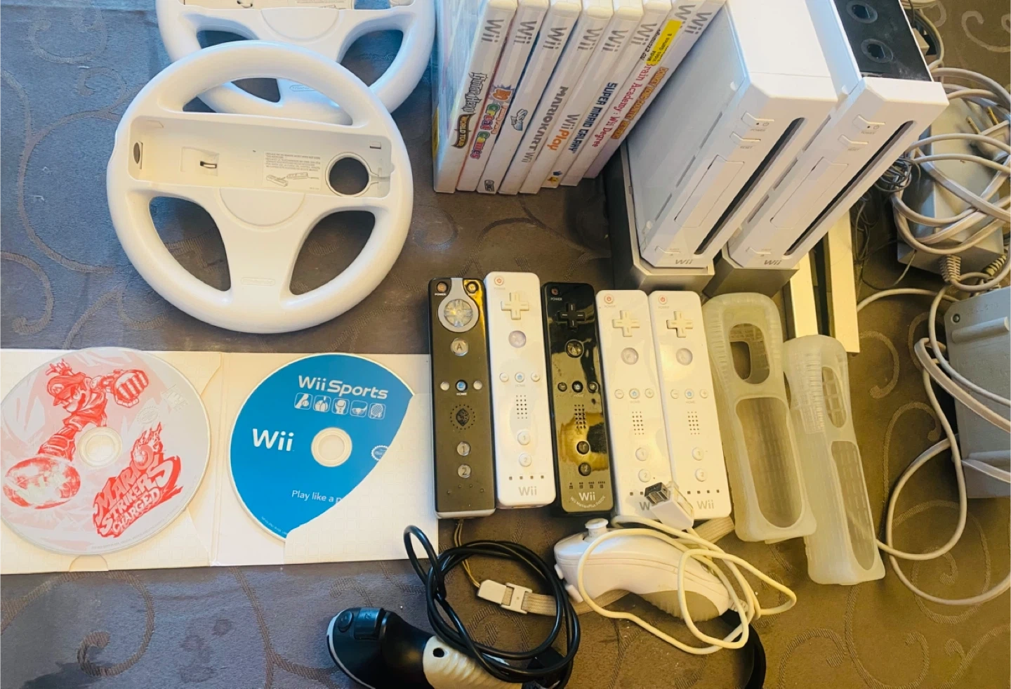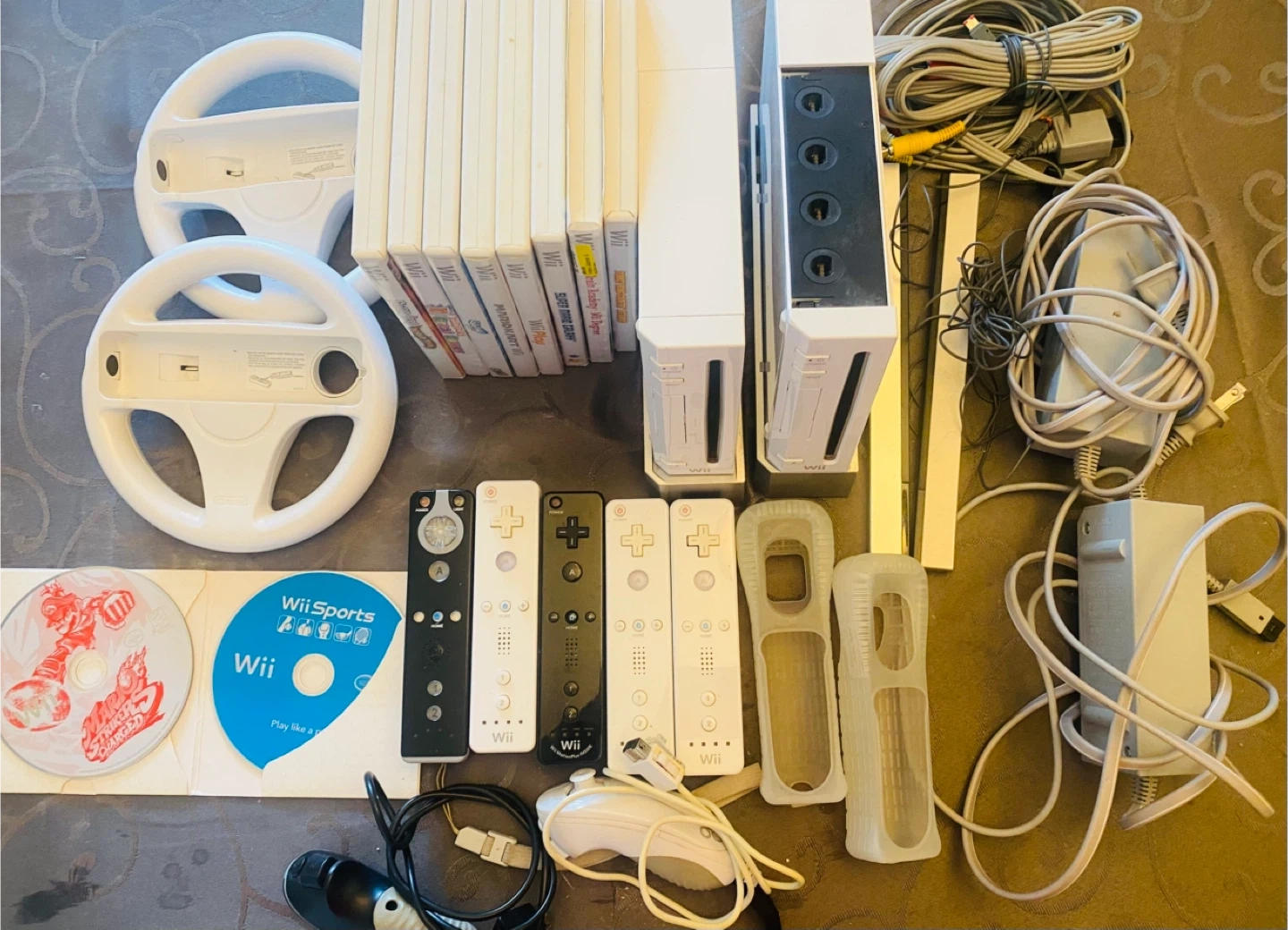 Selling a Nintendo Wii console bundle! Includes two Wii consoles, multiple Wii remotes, nunchucks, steering wheels, and a selection of games like Mario Kart Wii, Wii Sports, and Super Mario Galaxy. Perfect for family fun! 2 consoles