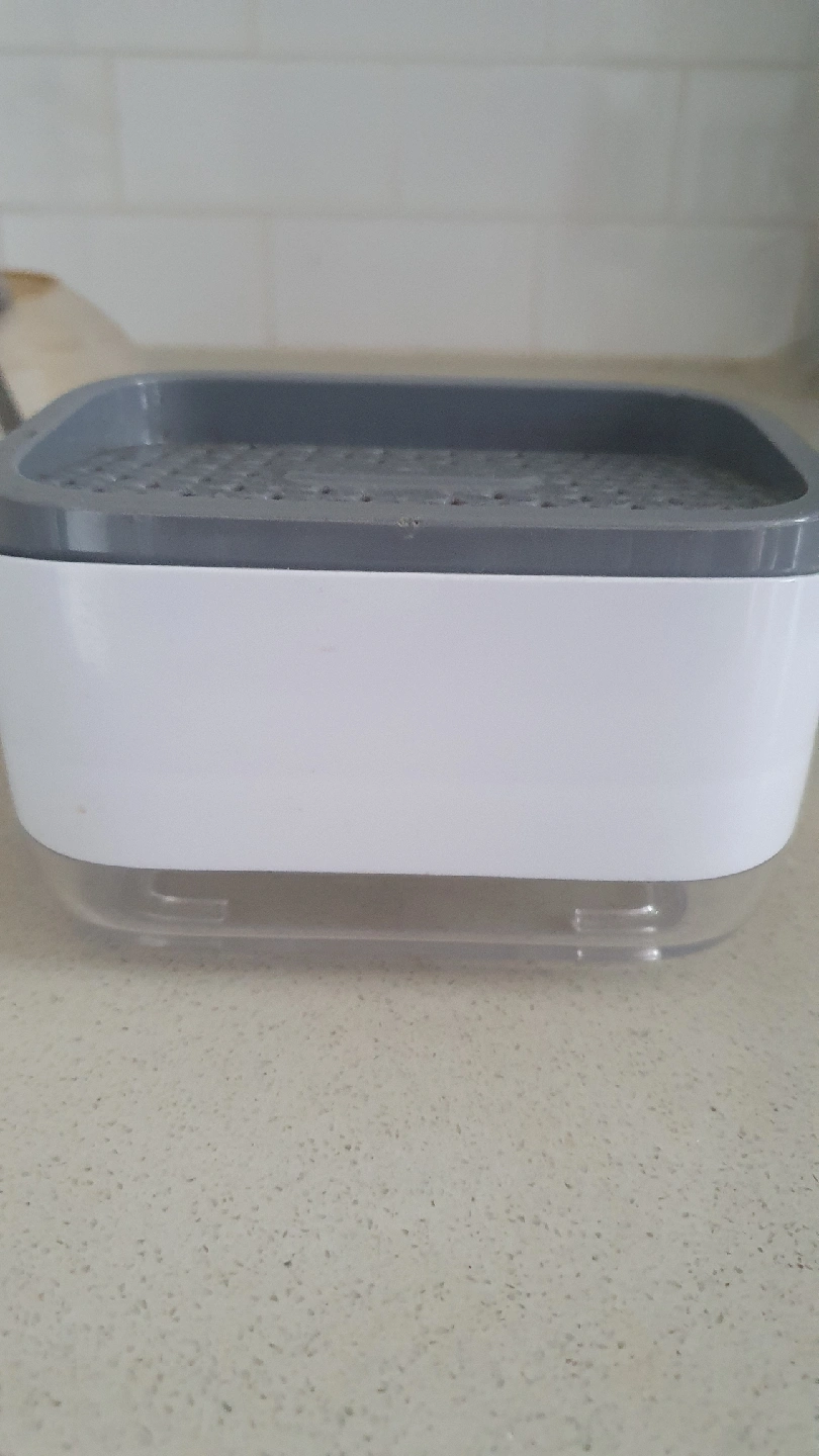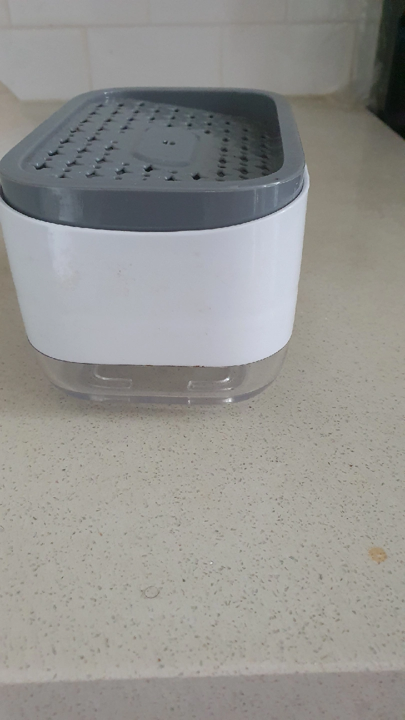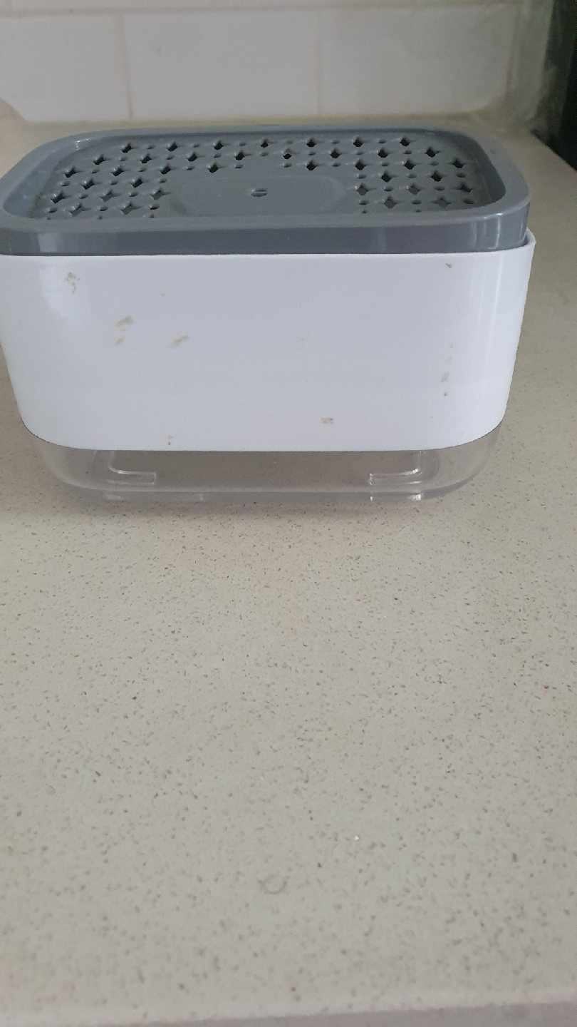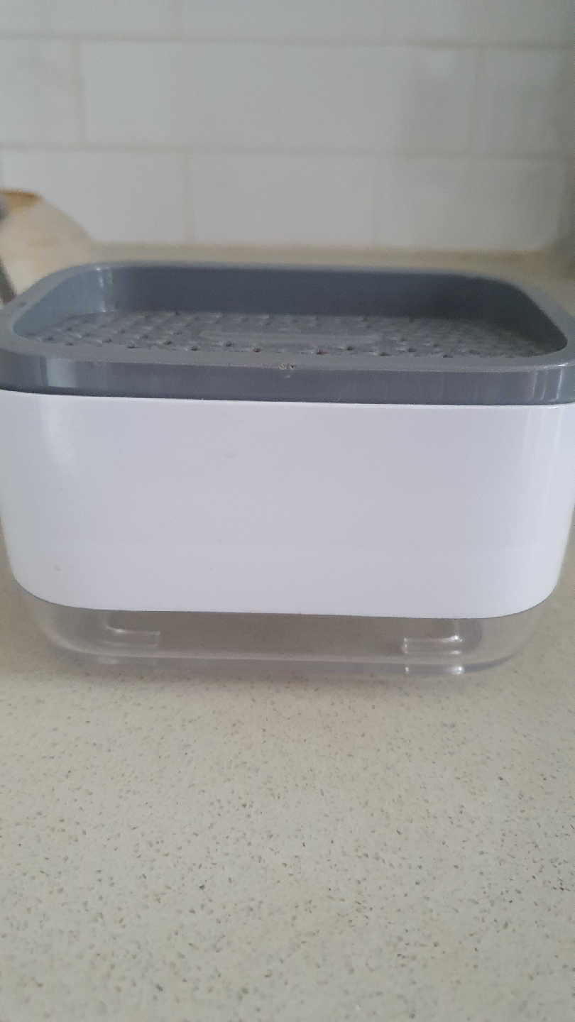 This is a soap dispensing sponge holder. It's white and grey and in good condition.