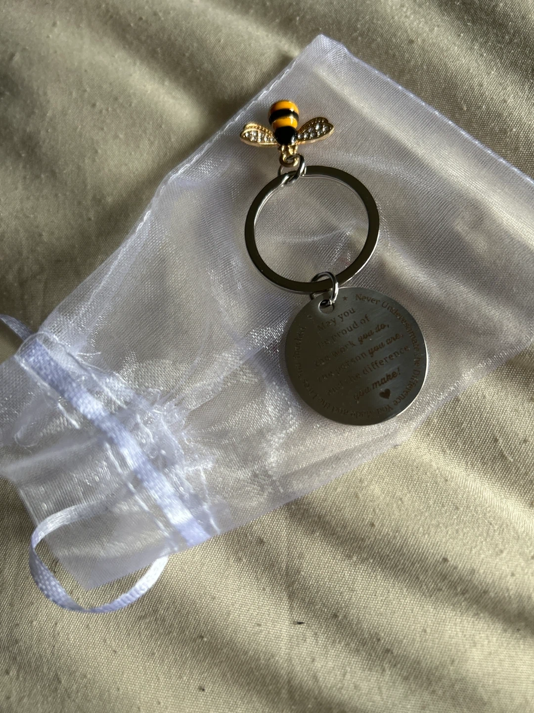 Cute bee keychain with a sweet message! The charm says, "May you be proud of the work you do, the person you are, and the difference you make!" Comes in a little drawstring bag, perfect for gifting or just to keep it safe