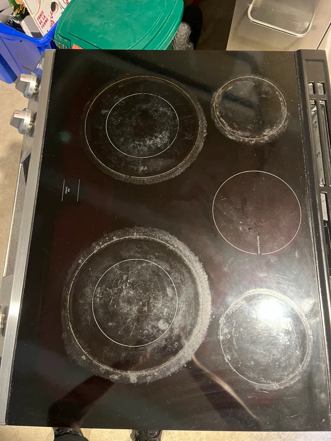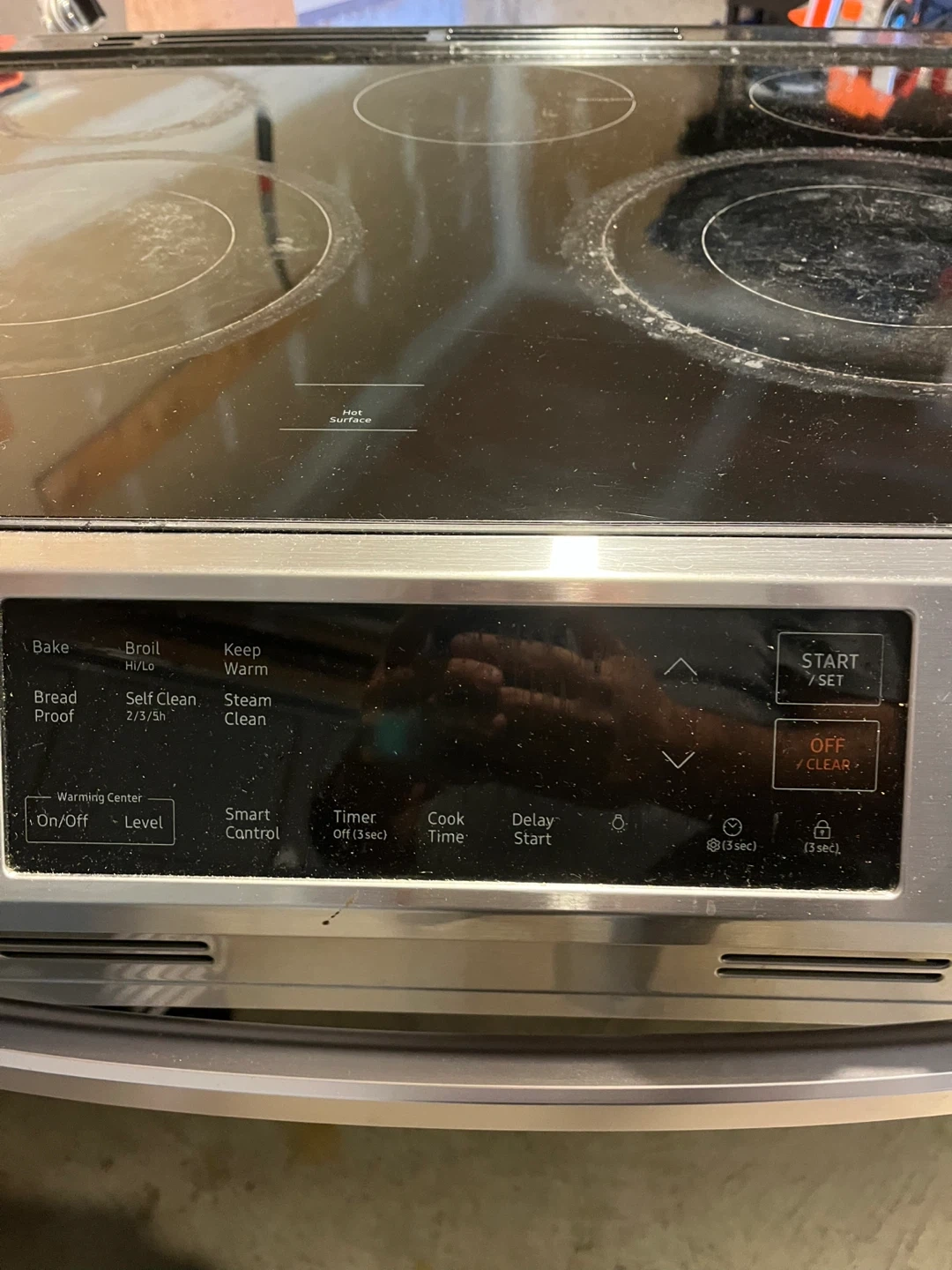 Selling a used Samsung electric range. It has a glass top with four burners and a warming center. The oven features bake, broil, and self-clean options. Please note that the cooktop shows signs of use.