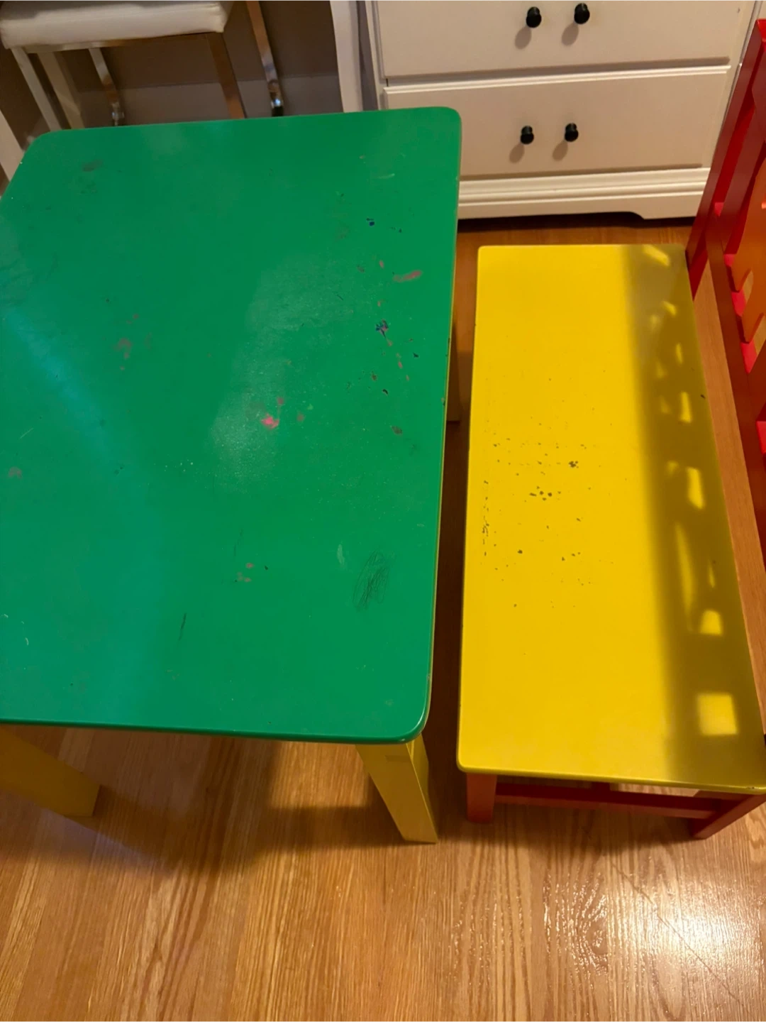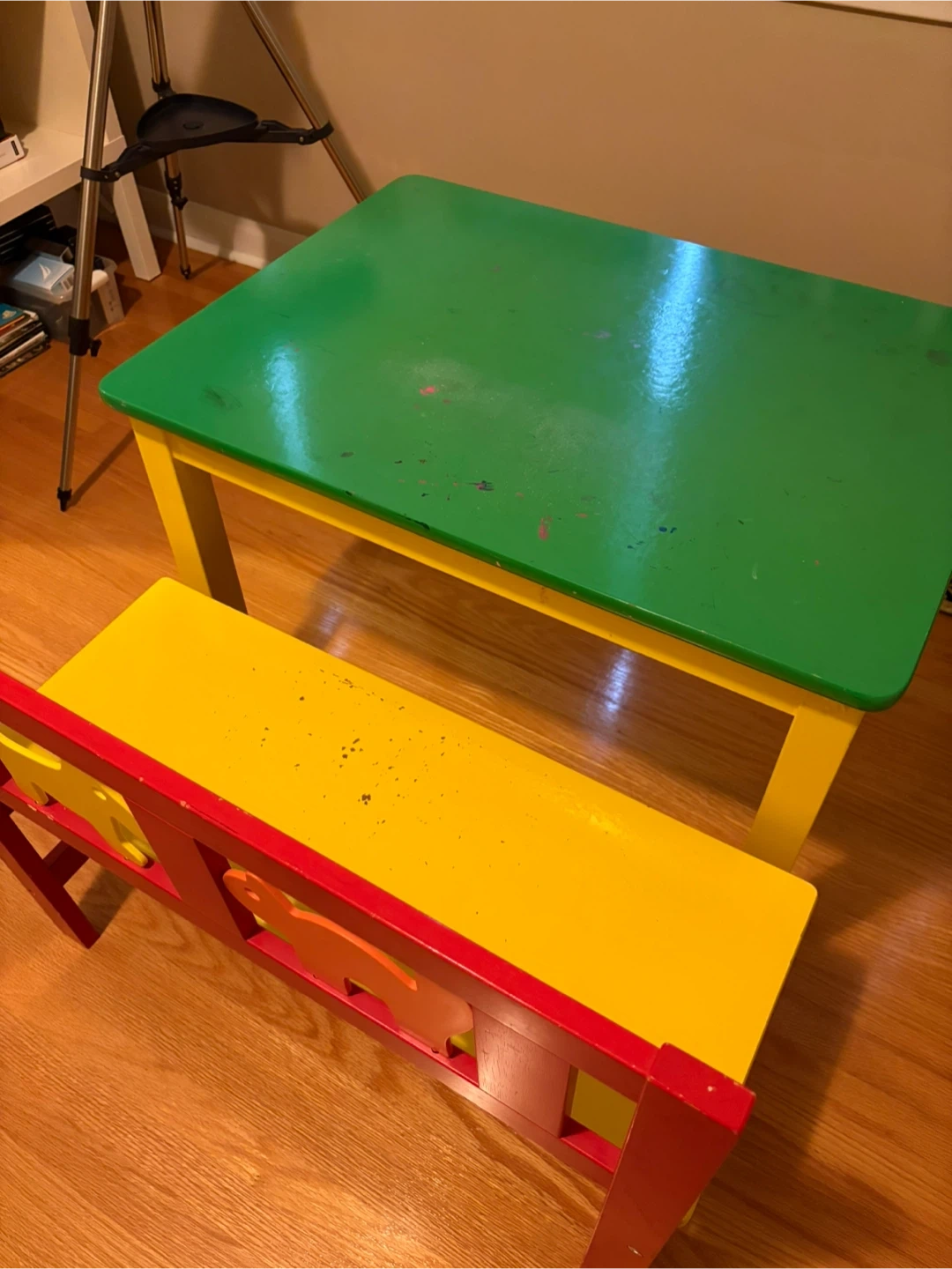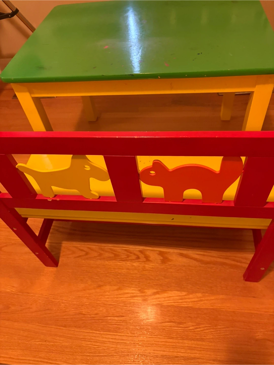 Selling a cute kids table and bench set! The table has a green top with yellow legs, and the bench is yellow with a red back featuring animal cutouts. Perfect for arts and crafts or snack time!