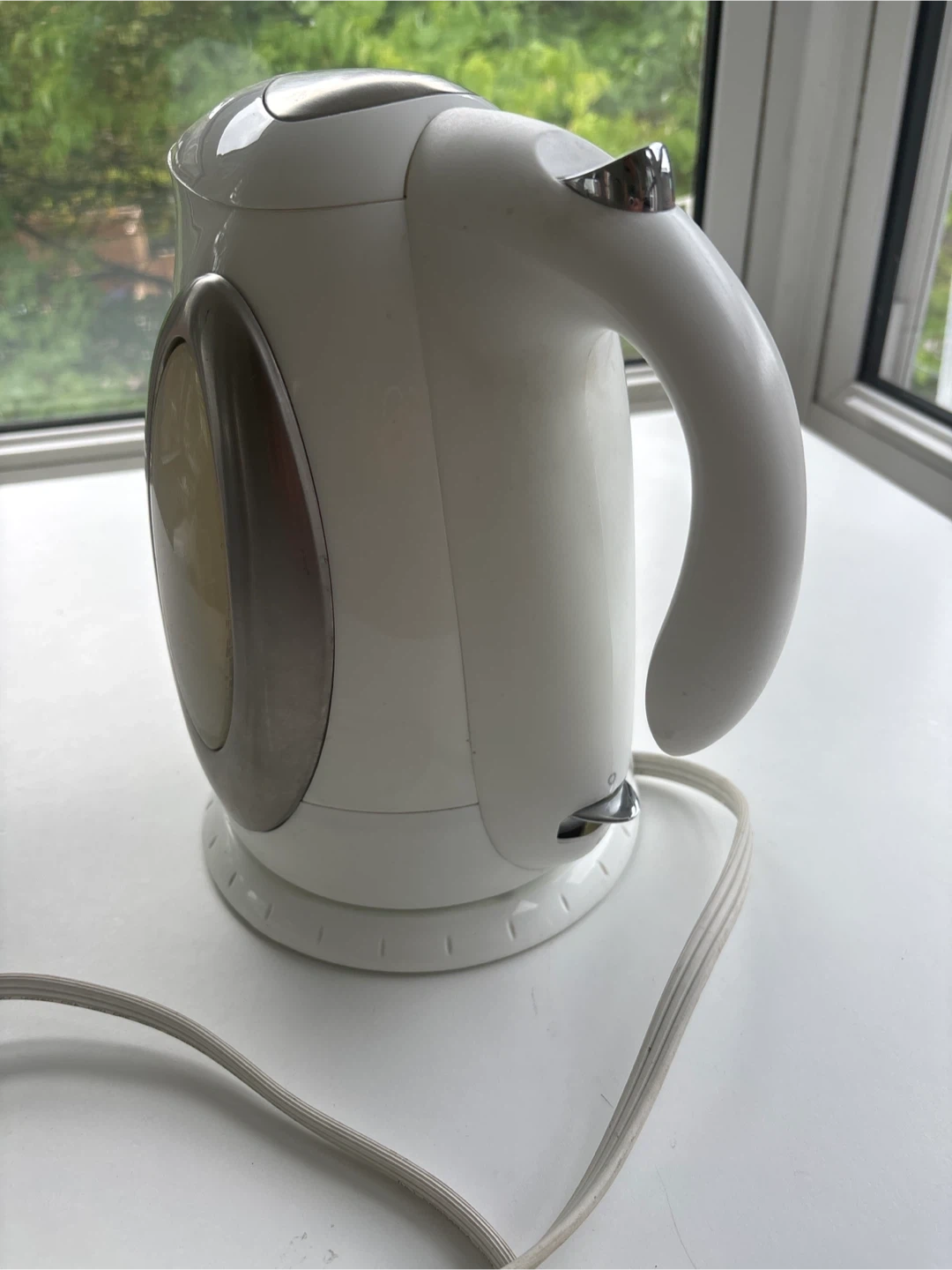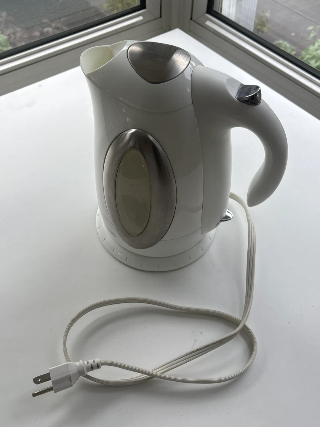 Selling a used white electric kettle. It's in good condition and ready to boil water for your tea or coffee! It has a comfortable handle and a convenient design for easy pouring