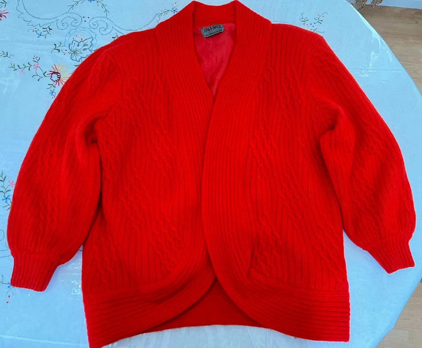 A lovely red cardigan from Intro! It's in great shape and ready for a new home. The material feels soft and cozy, perfect for layering during cooler weather