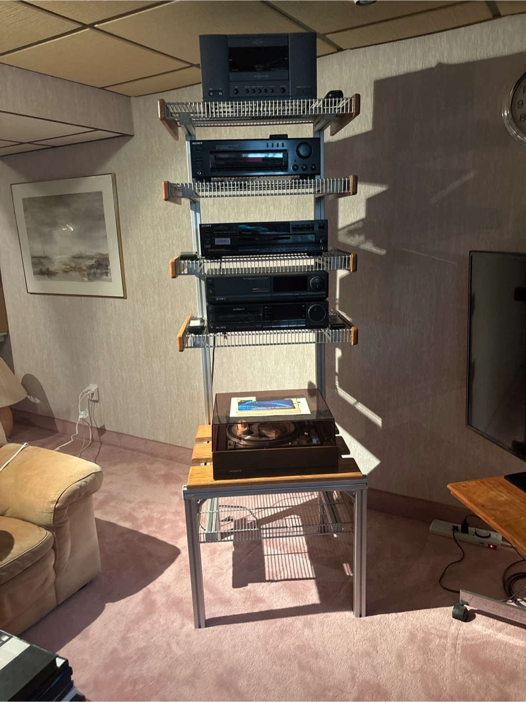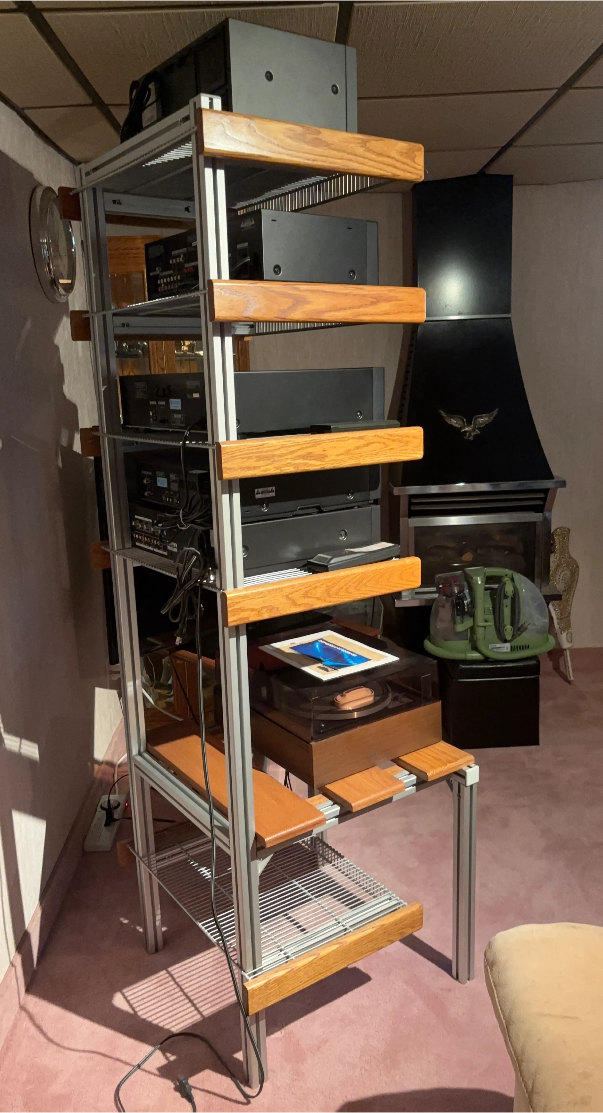 Selling a sturdy custom made audio/video equipment rack. It features an aluminum frame and oak trim. Perfect for organizing your stereo components and adding a touch of style to your listening space! The rack is in good condition and ready for a new home (Components not included)
