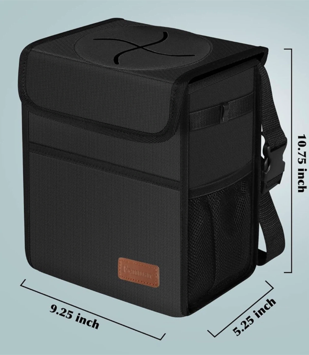Keep your car tidy with this Pemian car trash can! It's black and measures approximately 10.75 x 9.25 x 5.25 inches. Perfect for keeping your vehicle clean and organized