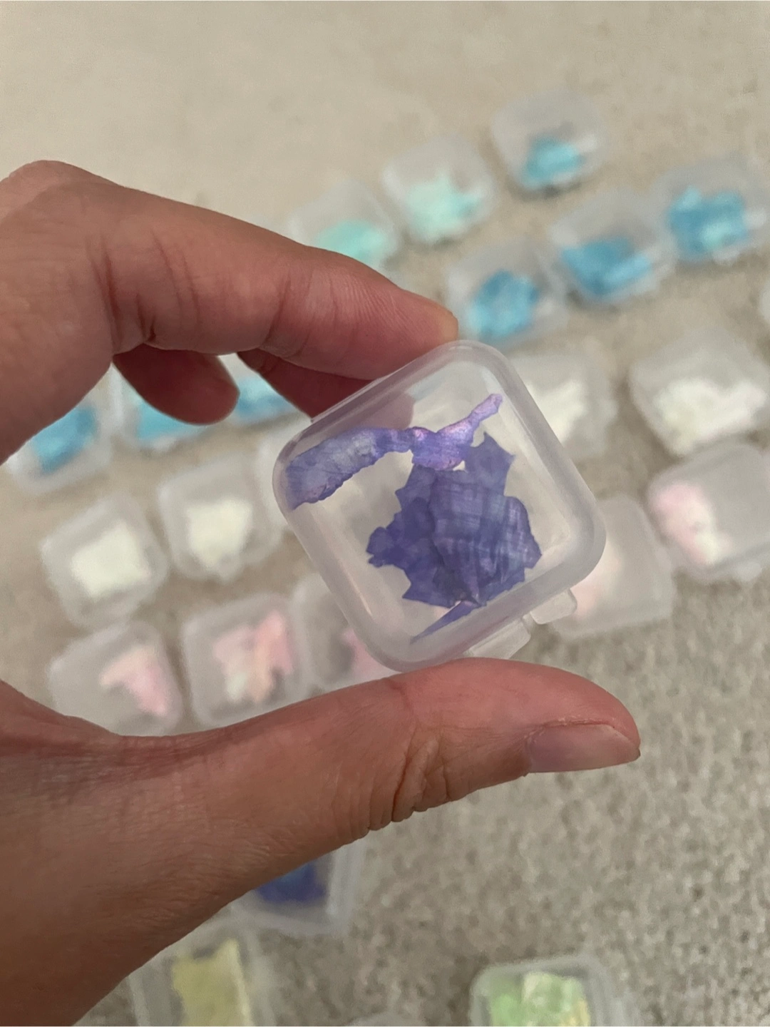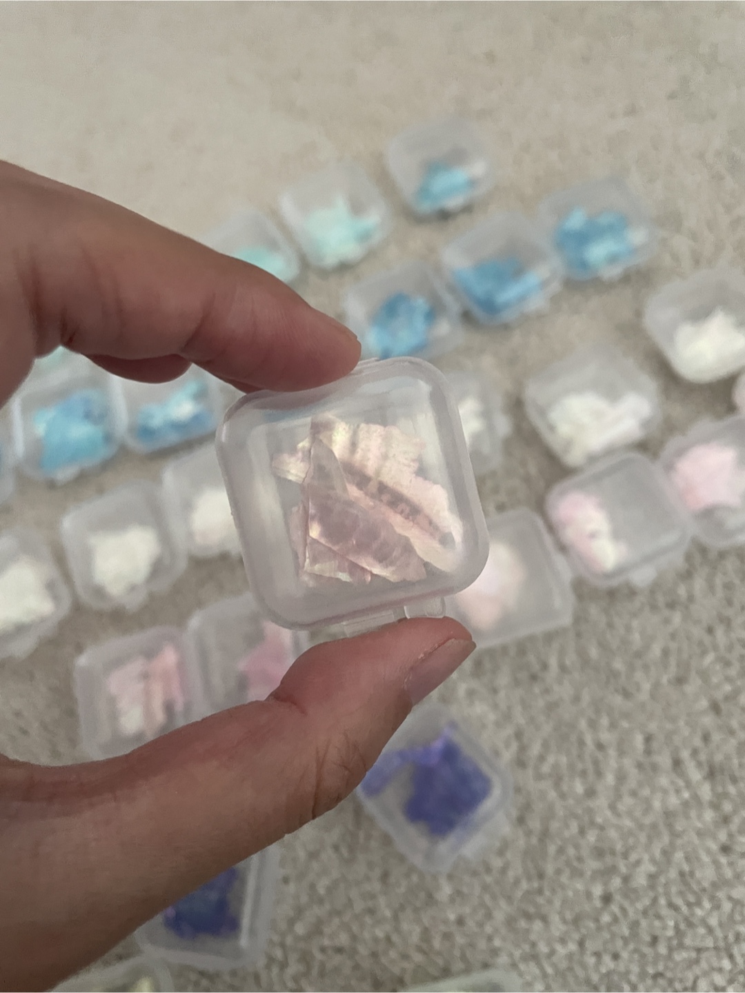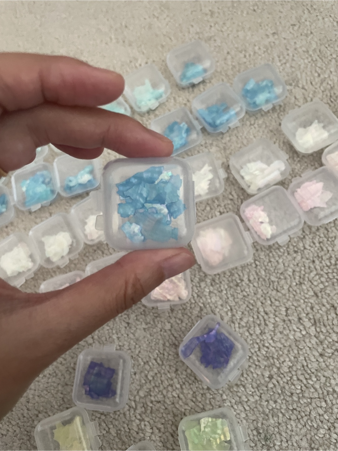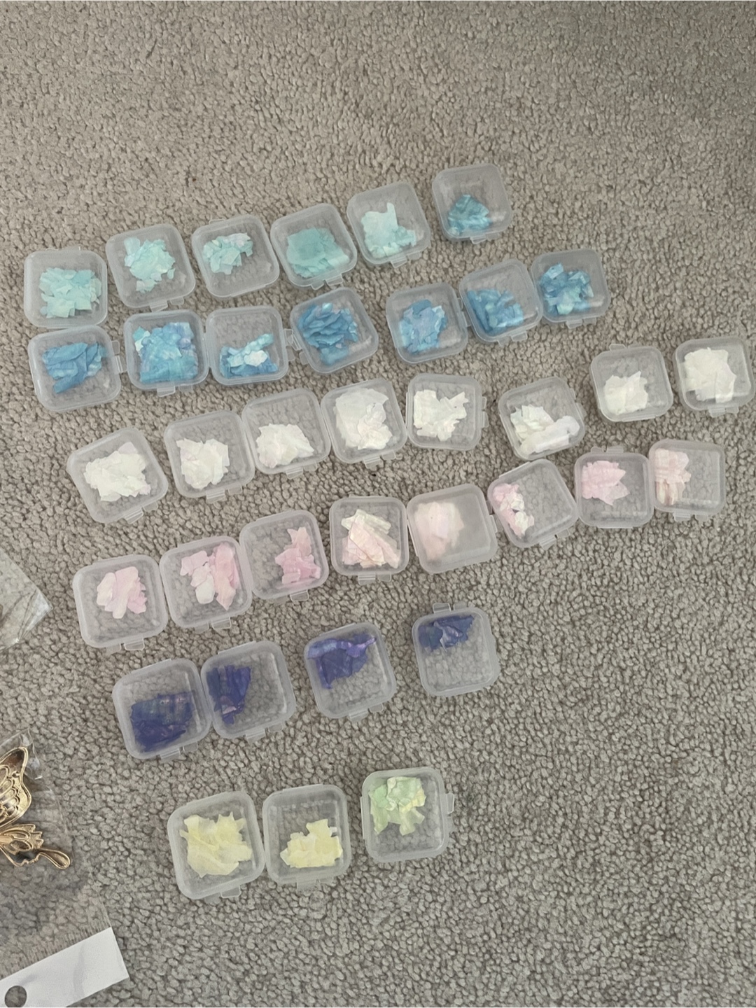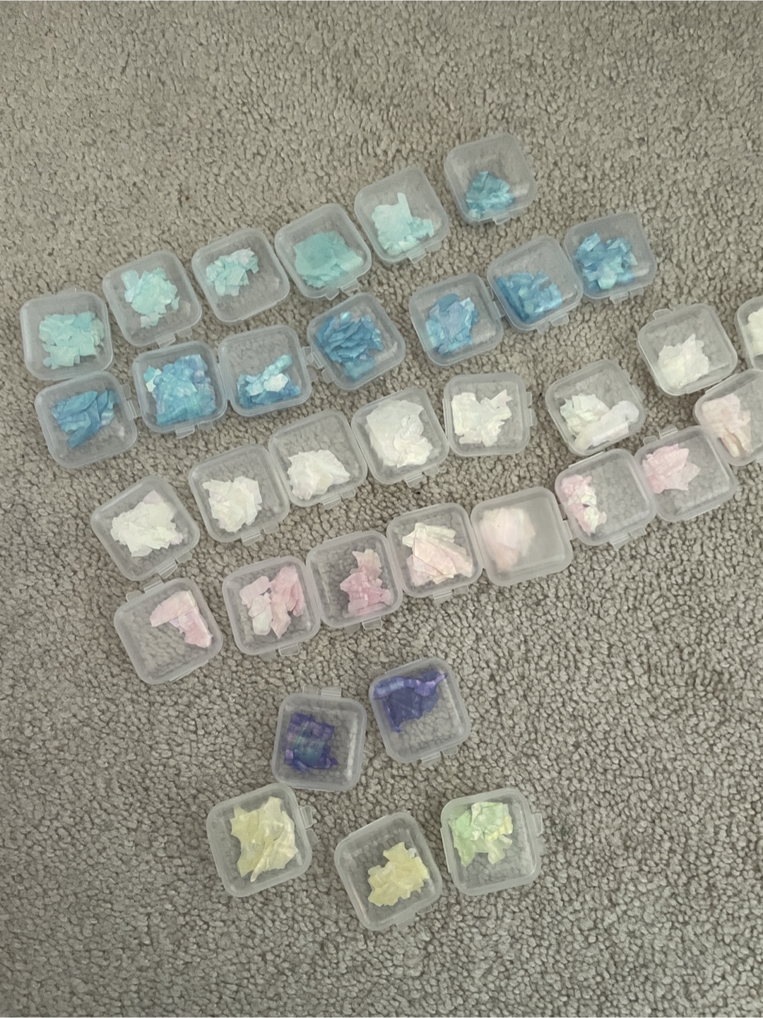 I'm selling a collection of nail art flakes in various colours, each neatly stored in its own little container. Perfect for adding a unique touch to your manicure!