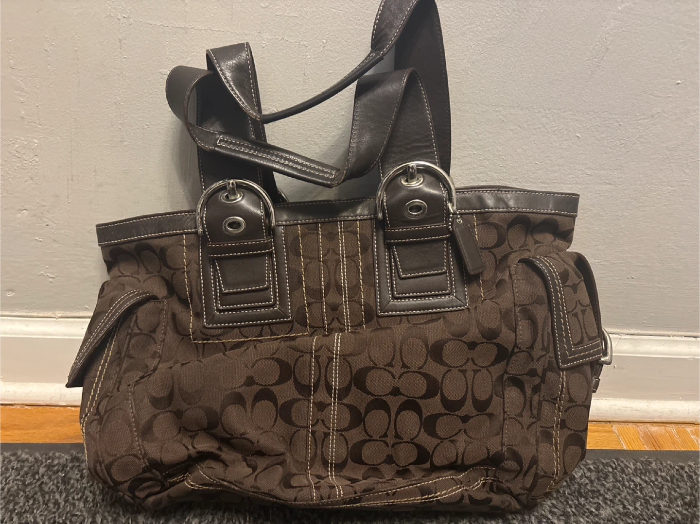 This is a genuine Coach tote bag in brown with the signature Coach print. It features leather straps and trim. It's in excellent condition and ready for a new home!