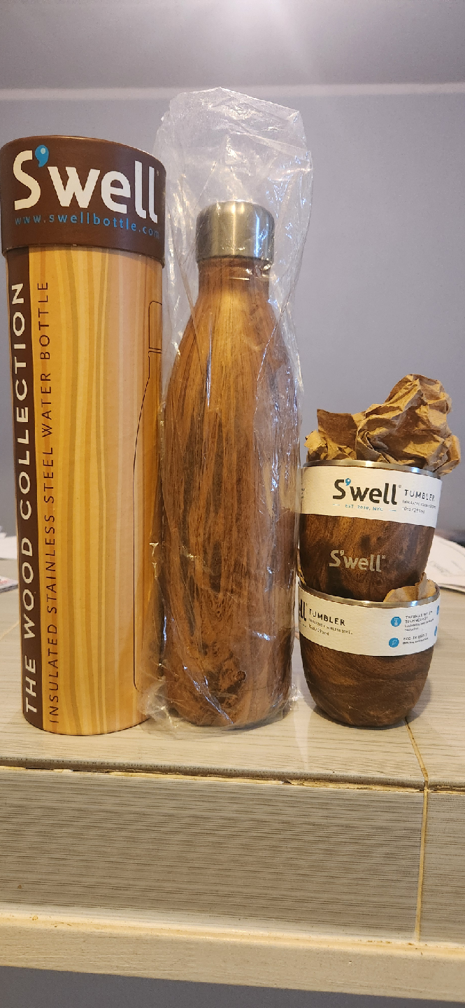 I have a S'well insulated stainless steel water bottle from The Wood Collection, along with two S'well tumblers. They're all brand new and still in their original packaging!