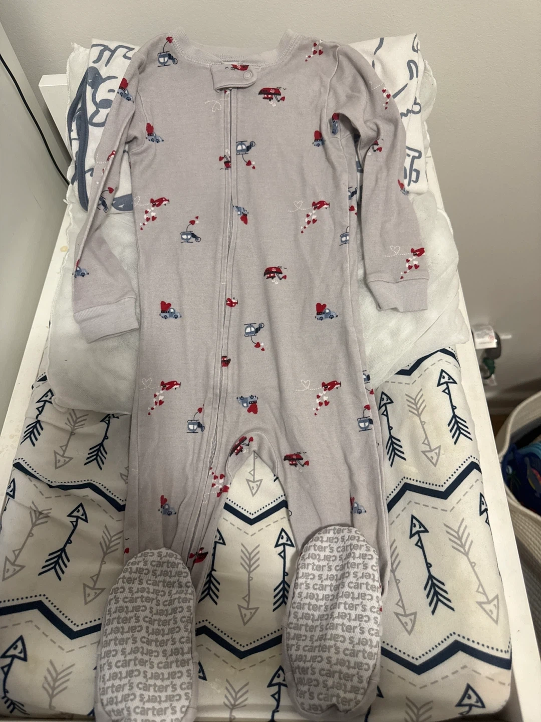 Cozy Carter's footed pajamas with a cute airplane and vehicle pattern. Perfect for keeping your little one snug during sleep or playtime! Size: 24 months
