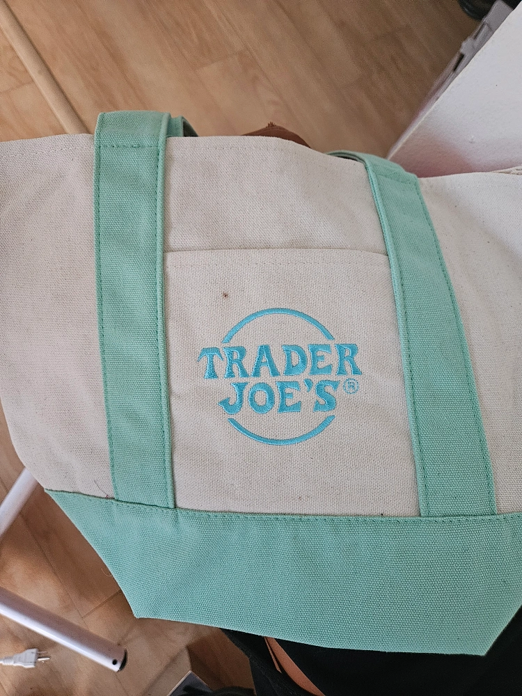 Trader Joe's tote bag with the logo embroidered on the front pocket. The bag is white with turquoise accents. It is in good condition and ready for a new home!