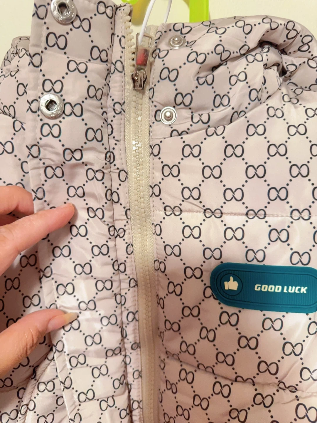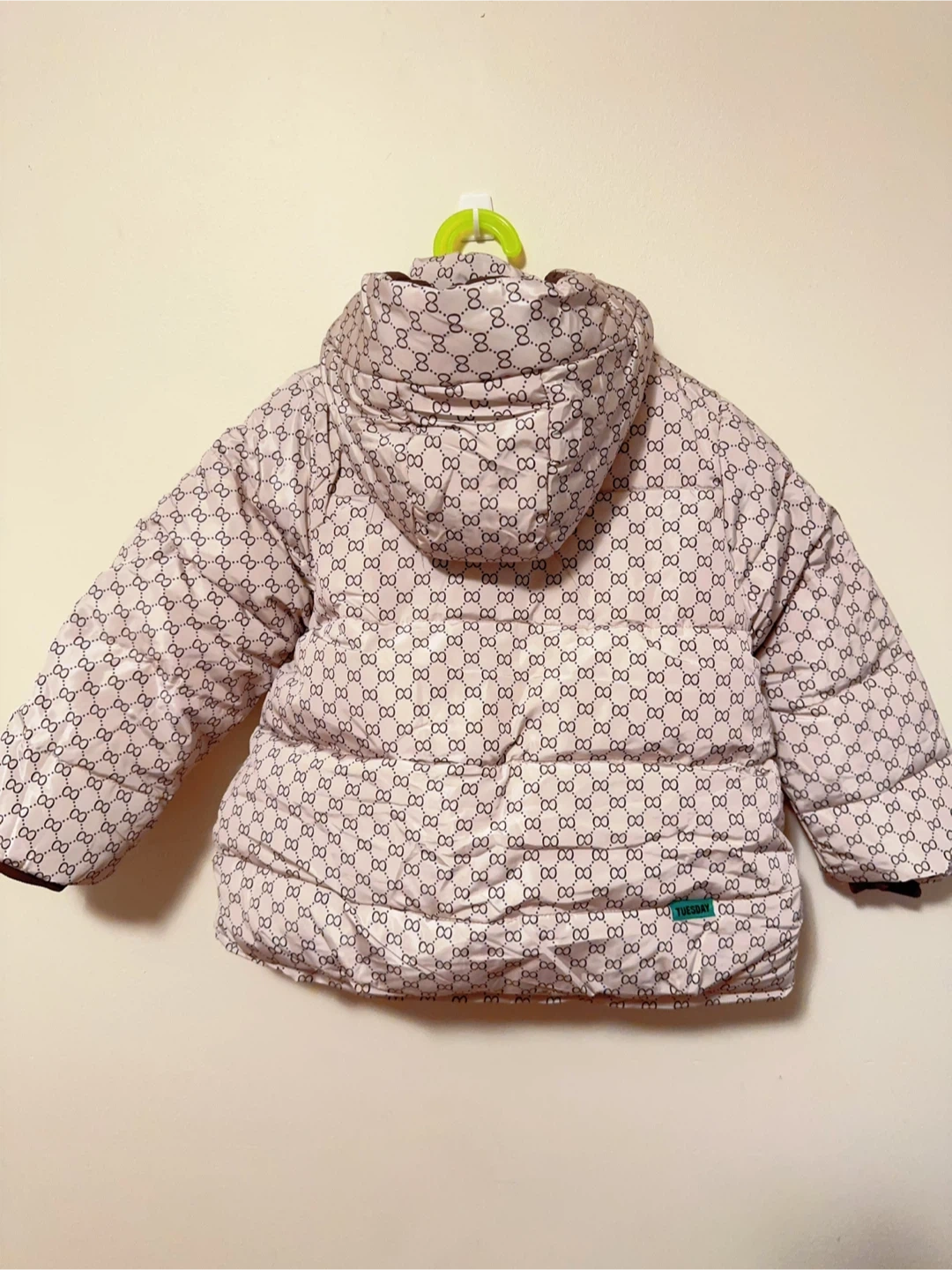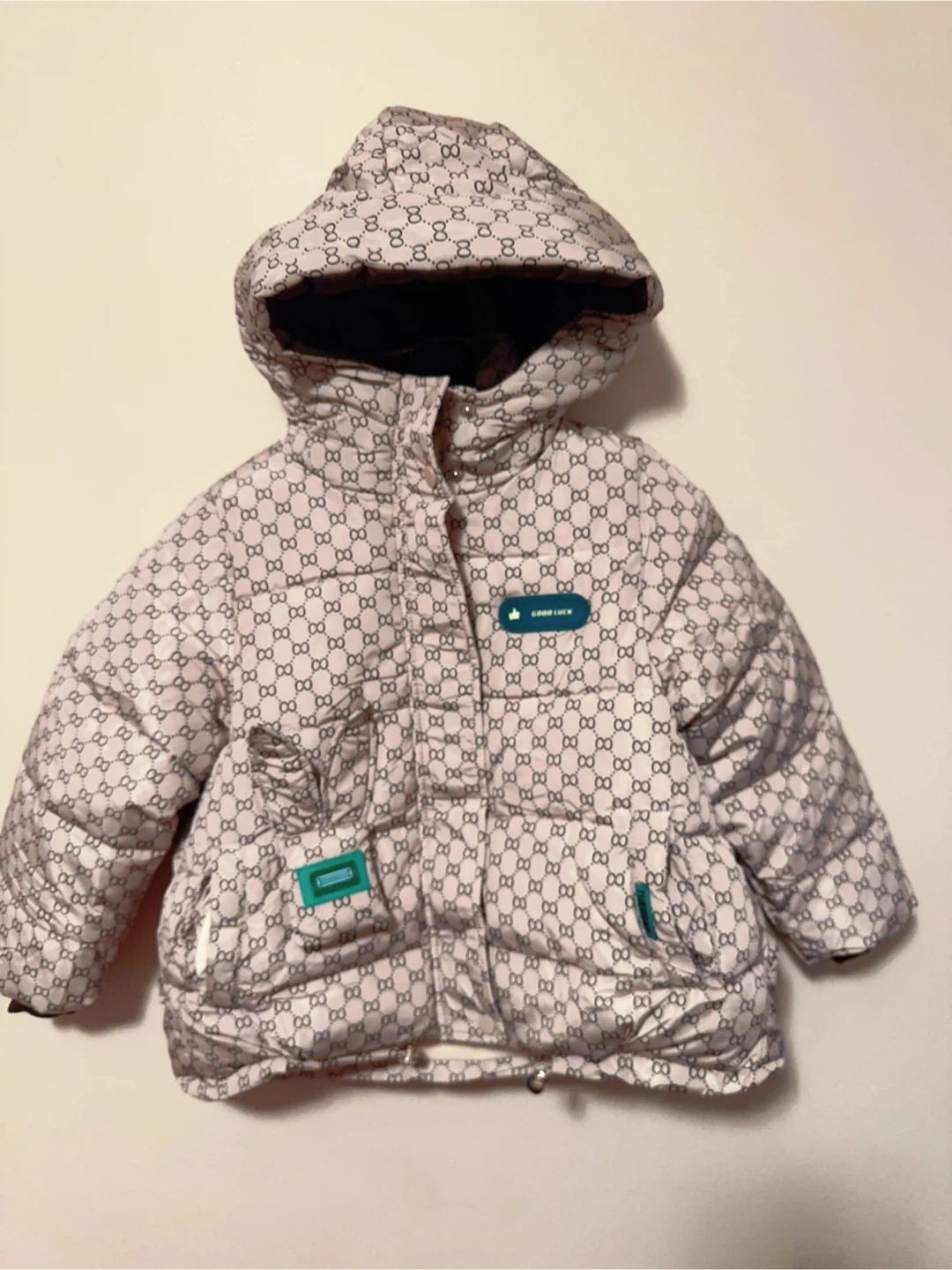 A super cute and cozy padded winter jacket for kids! It features a repeating pattern and a hood to keep your little one warm during the colder months. It's in great condition and ready for a new home!