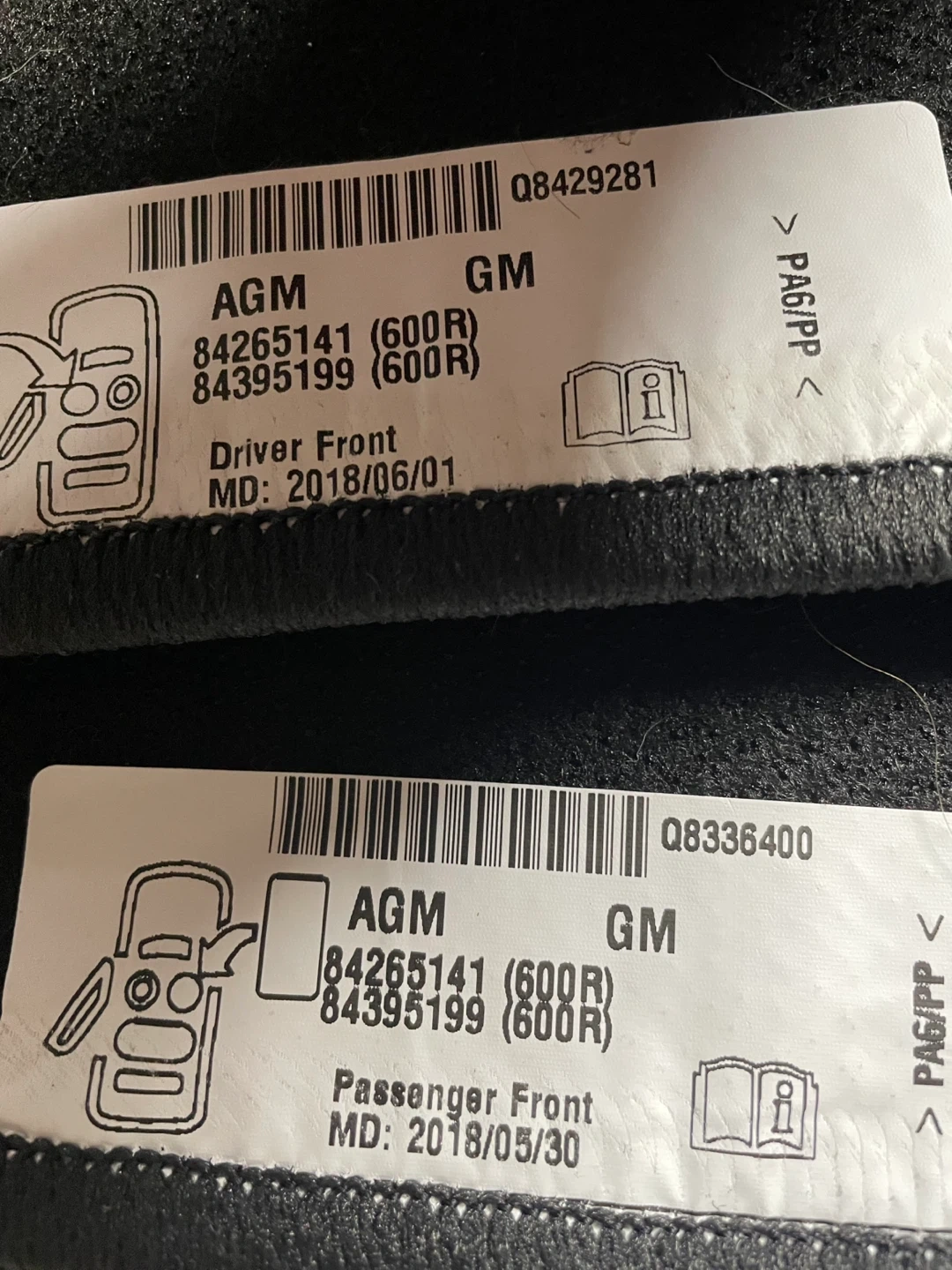 These mats are for the driver front, passenger front, and second row. The manufacturing date on the labels is June 01, 2018 and May 30, 2018