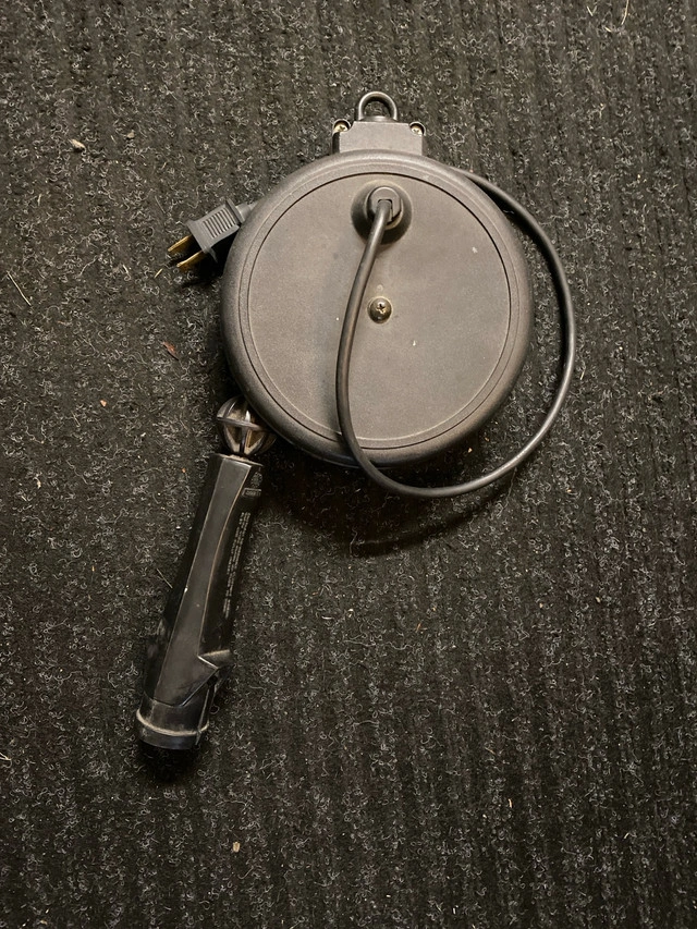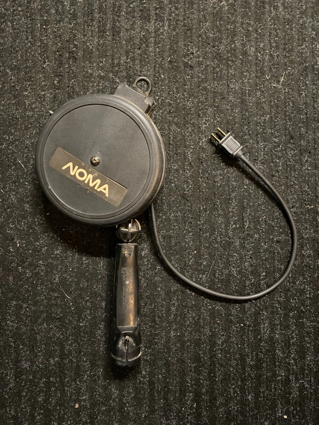 Illuminate your workspace with this Noma retractable light cord featuring a durable plastic housing, a convenient retractable cord, and a standard plug. This is a used item and shows signs of wear, but it's fully functional and ready to brighten up your projects. It would be ideal for a garage or workspace. If the ad's up, the light's available!