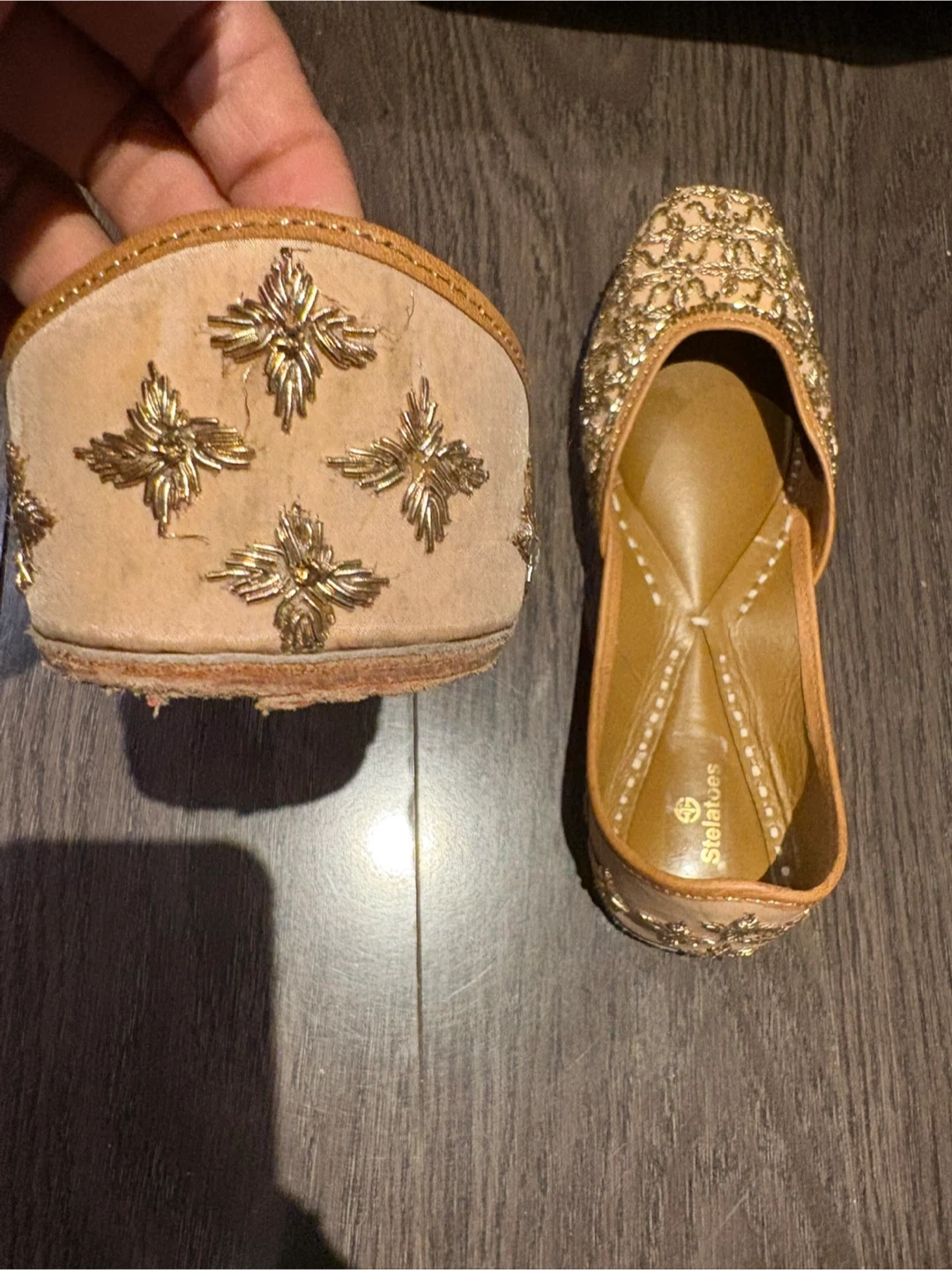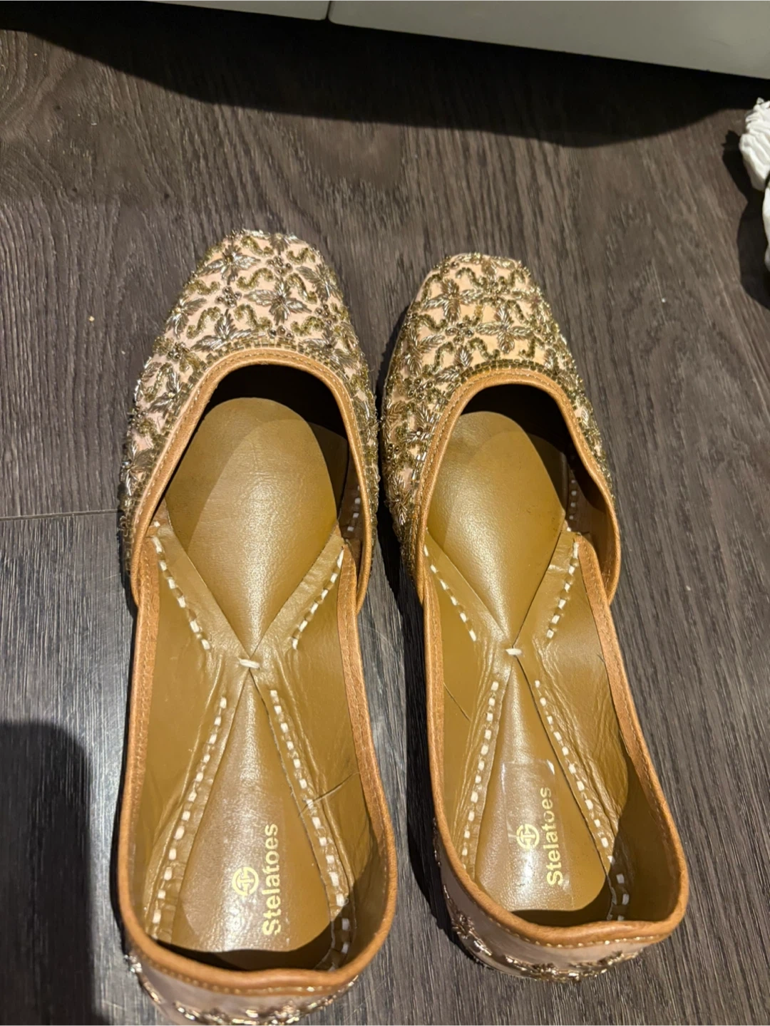 These are a pair of Stelatoes women's jutti shoes. They are gold in colour and have embellishments. They are in good condition and ready for a new home!