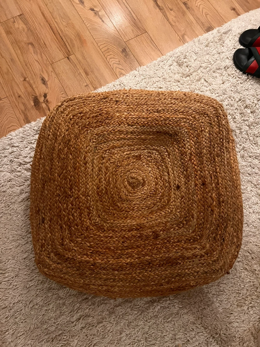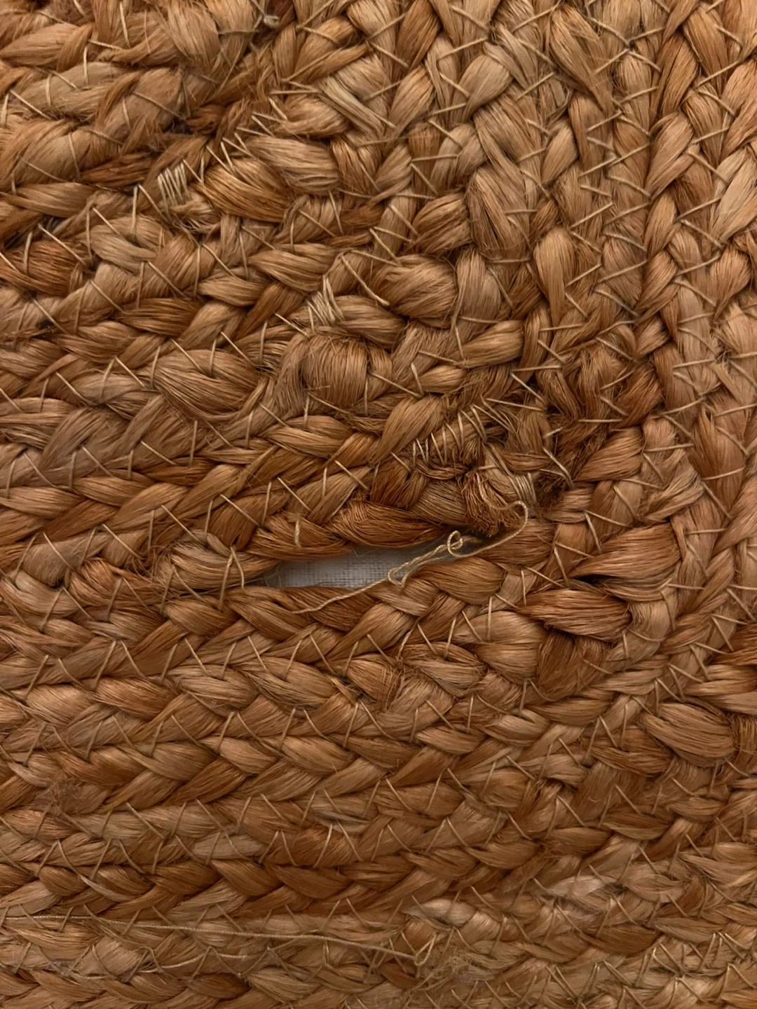 Selling a woven jute pouf ottoman. It has some minor wear and tear, including a small hole and some loose threads. Please see the photos for details! Just needs to be stitched up 🧵 🪡 or you can just turn it upside down.