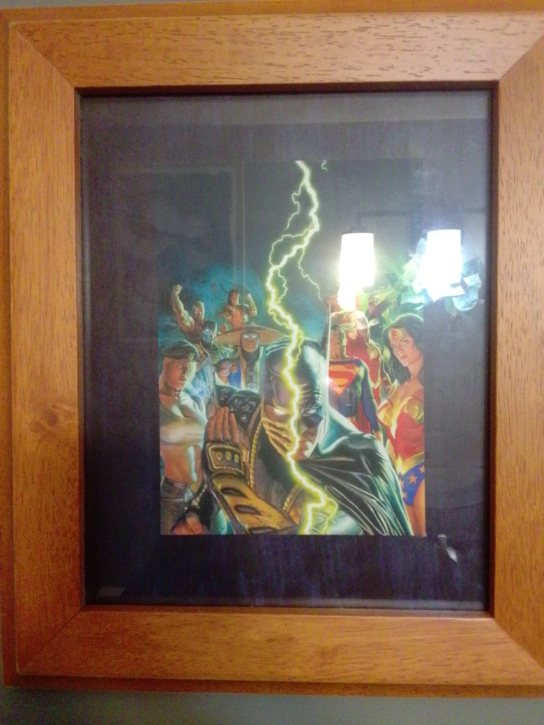Here's a framed artwork featuring characters from Justice League and Mortal Kombat! It's a cool piece for any fan of these franchises, ready to hang and add some character to your space