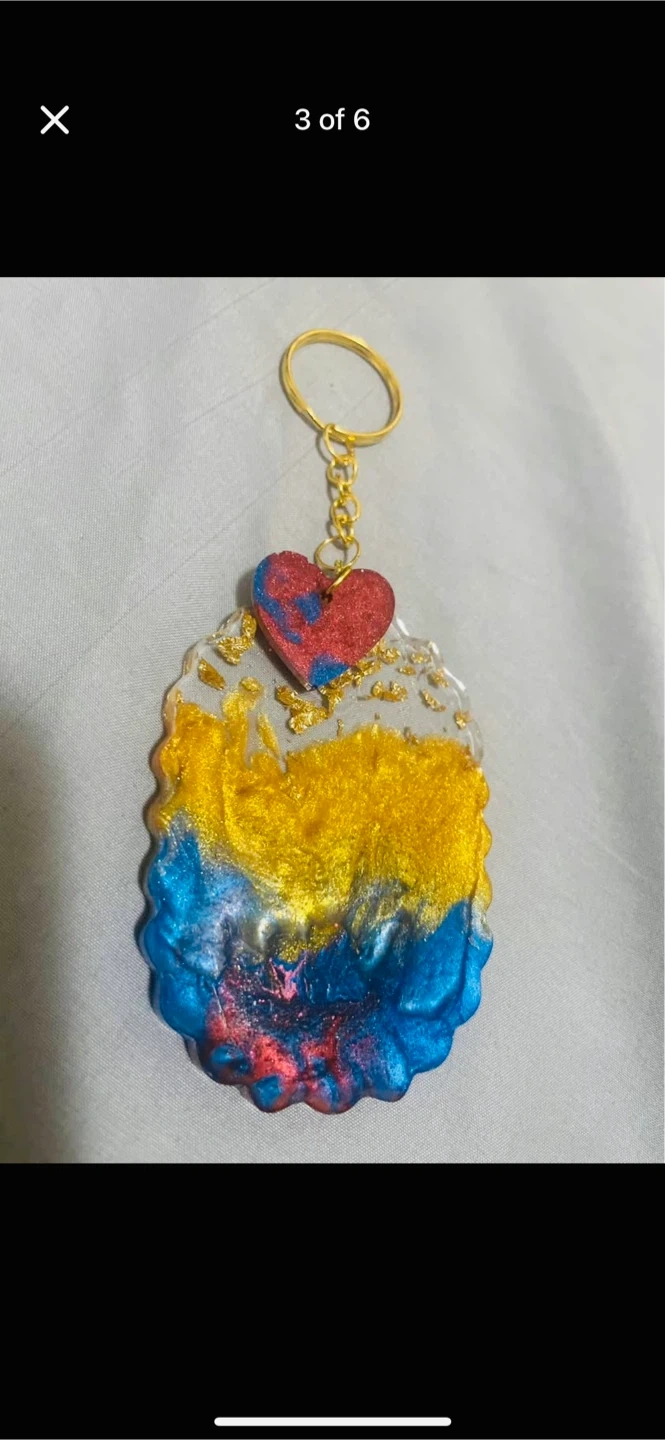 This is a handmade resin keychain with a heart accent! The colors are blue, gold, and red