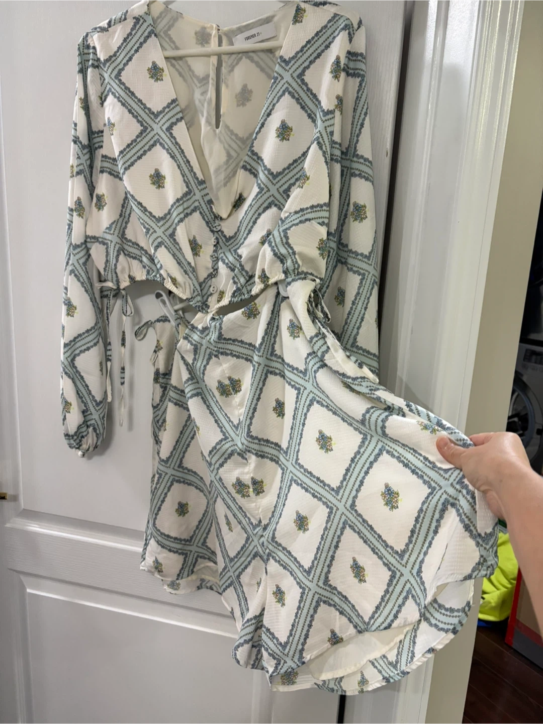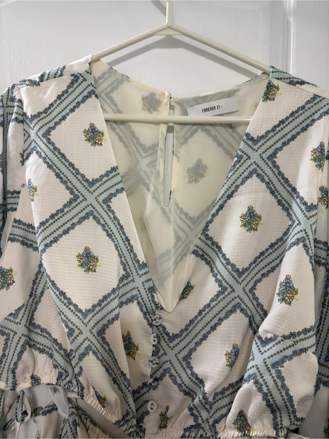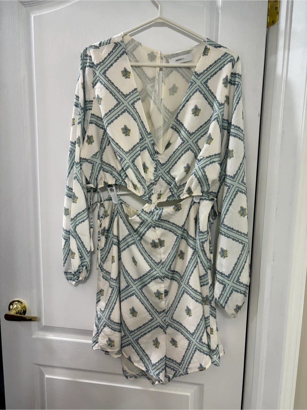 This is a cute romper from Forever 21 size XL. It features a unique floral and diamond pattern