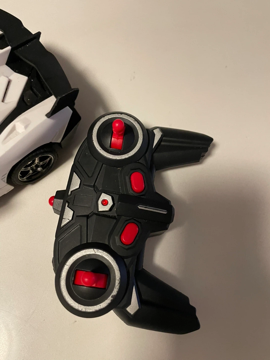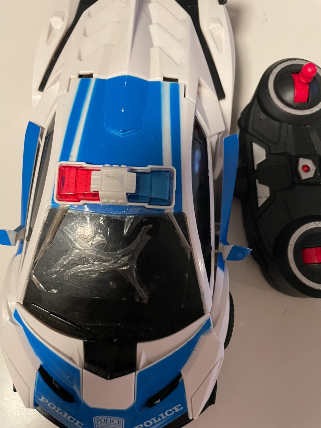 Selling a remote-controlled police car. It's white and blue and comes with a remote control. Great for kids who love cars and police vehicles! One of the rear wheel is loss and sometime comes out.