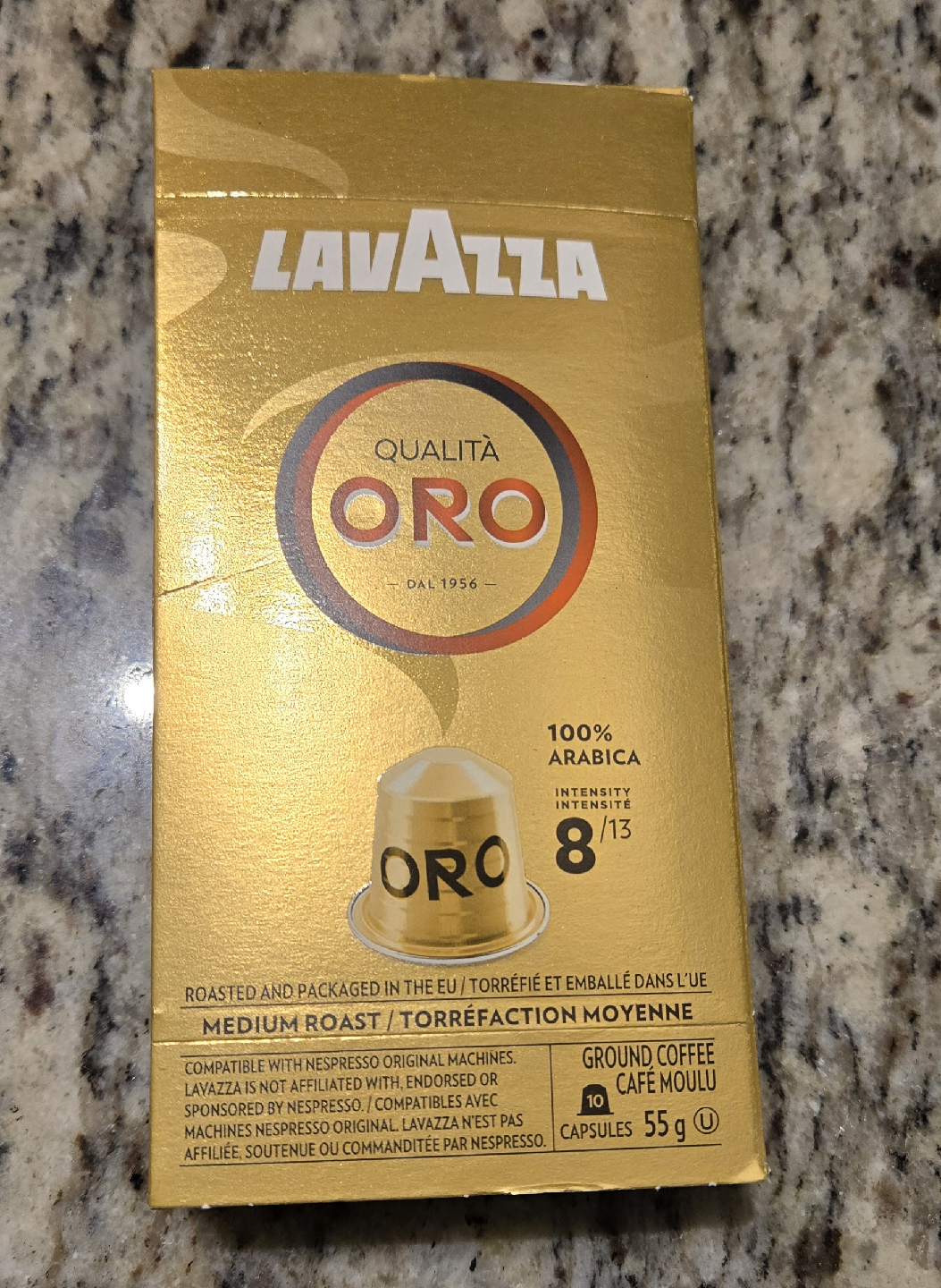 Selling 3 boxes of Lavazza Qualita Oro Nespresso compatible capsules. This is a medium roast with an intensity of 8/13. Each box contains 10 capsules with 55g of ground coffee