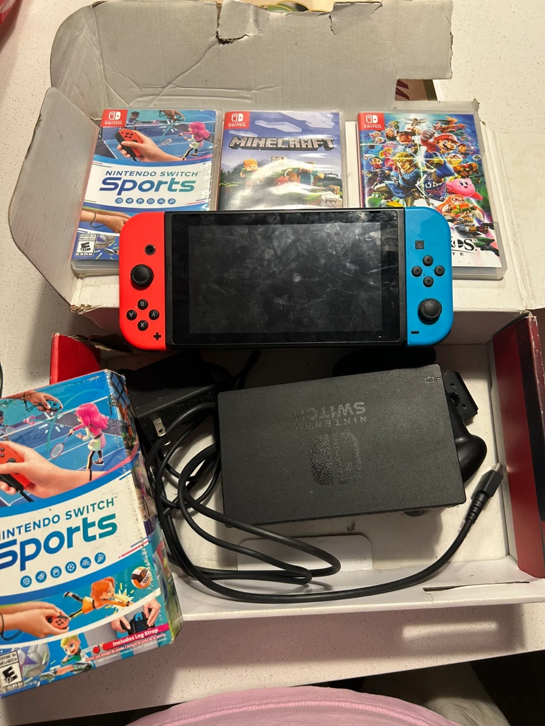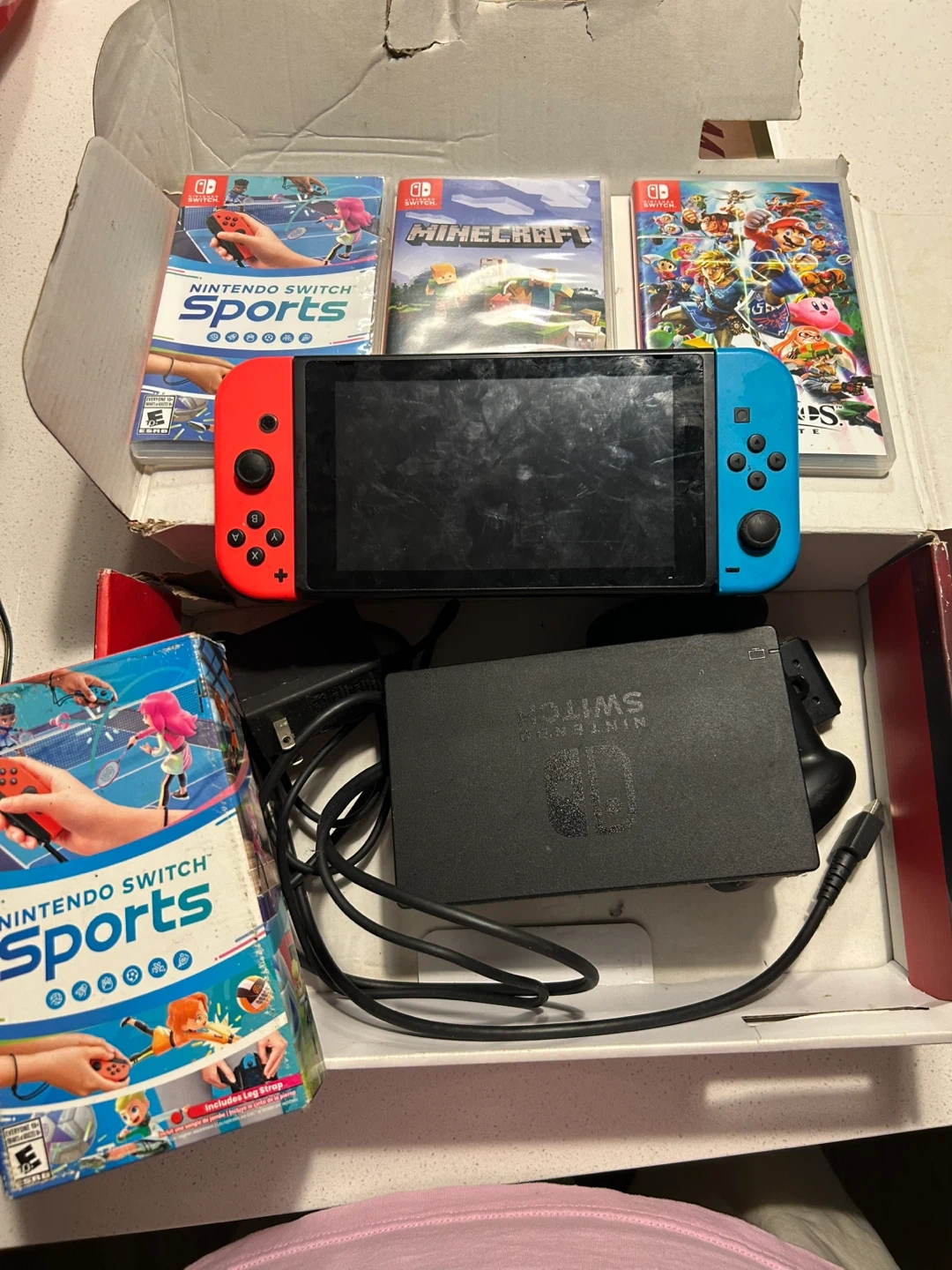 Selling a Nintendo Switch bundle! It comes with the console, dock, and charger. Also included are the games Nintendo Switch Sports, Minecraft, and Kirby and the Forgotten Land! Great for some family fun!