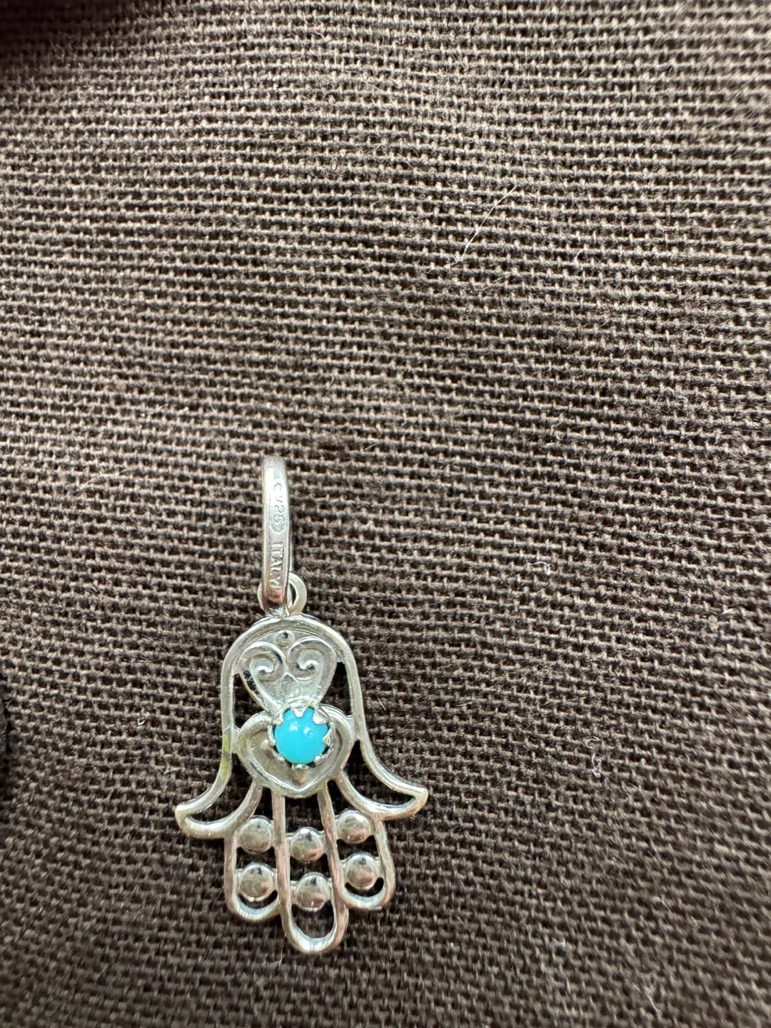 Selling a lovely silver Hamsa hand pendant. It has a small turquoise stone in the centre. The pendant is stamped '925 Italy'. It's in great condition!