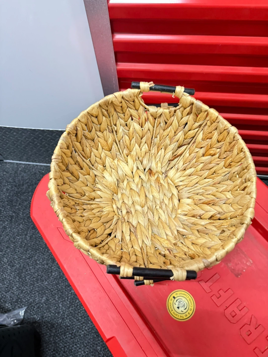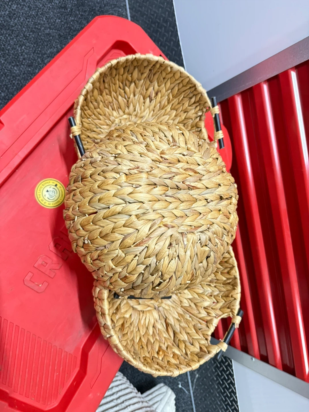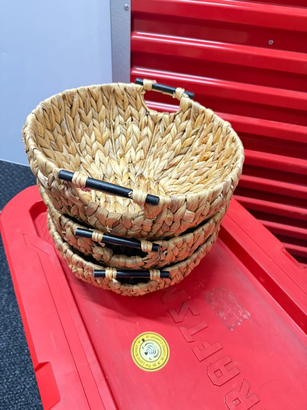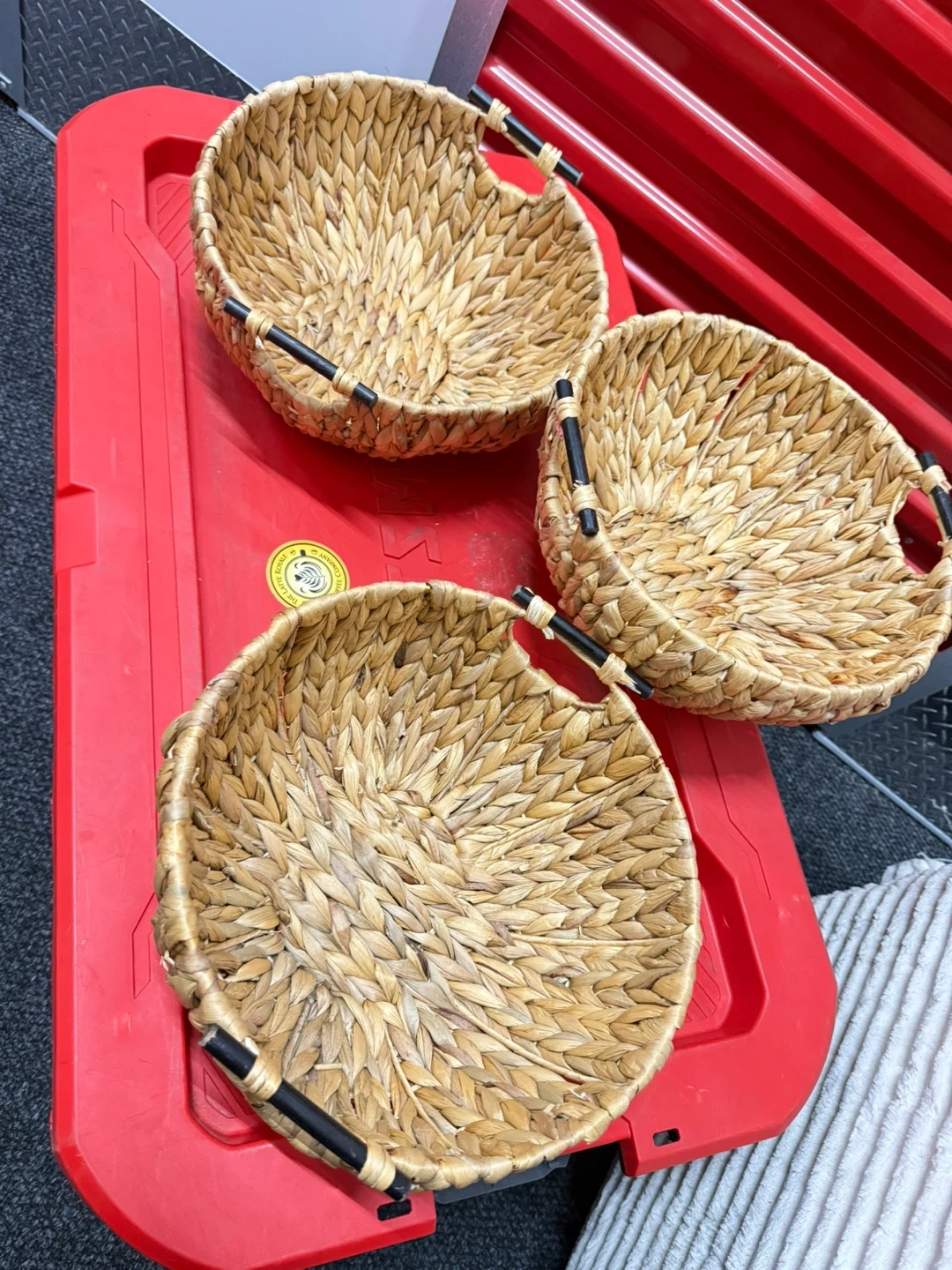Selling a set of three woven baskets, perfect for storage or decor! They have a natural, rustic look with black handles. They are in good condition and ready for a new home
