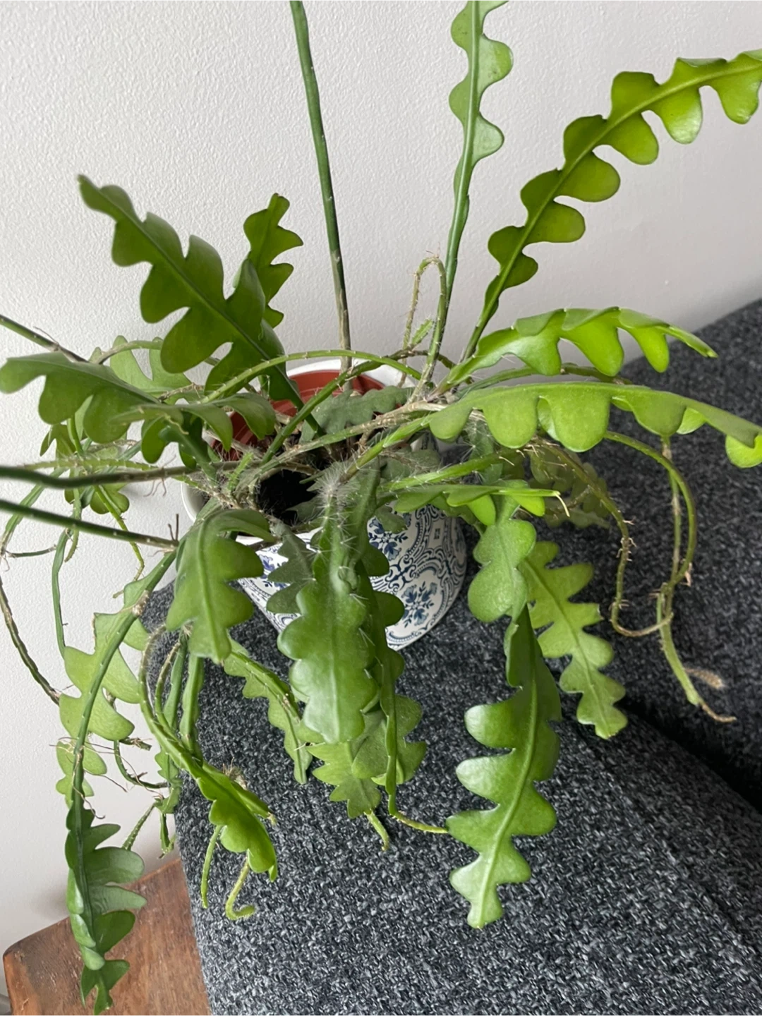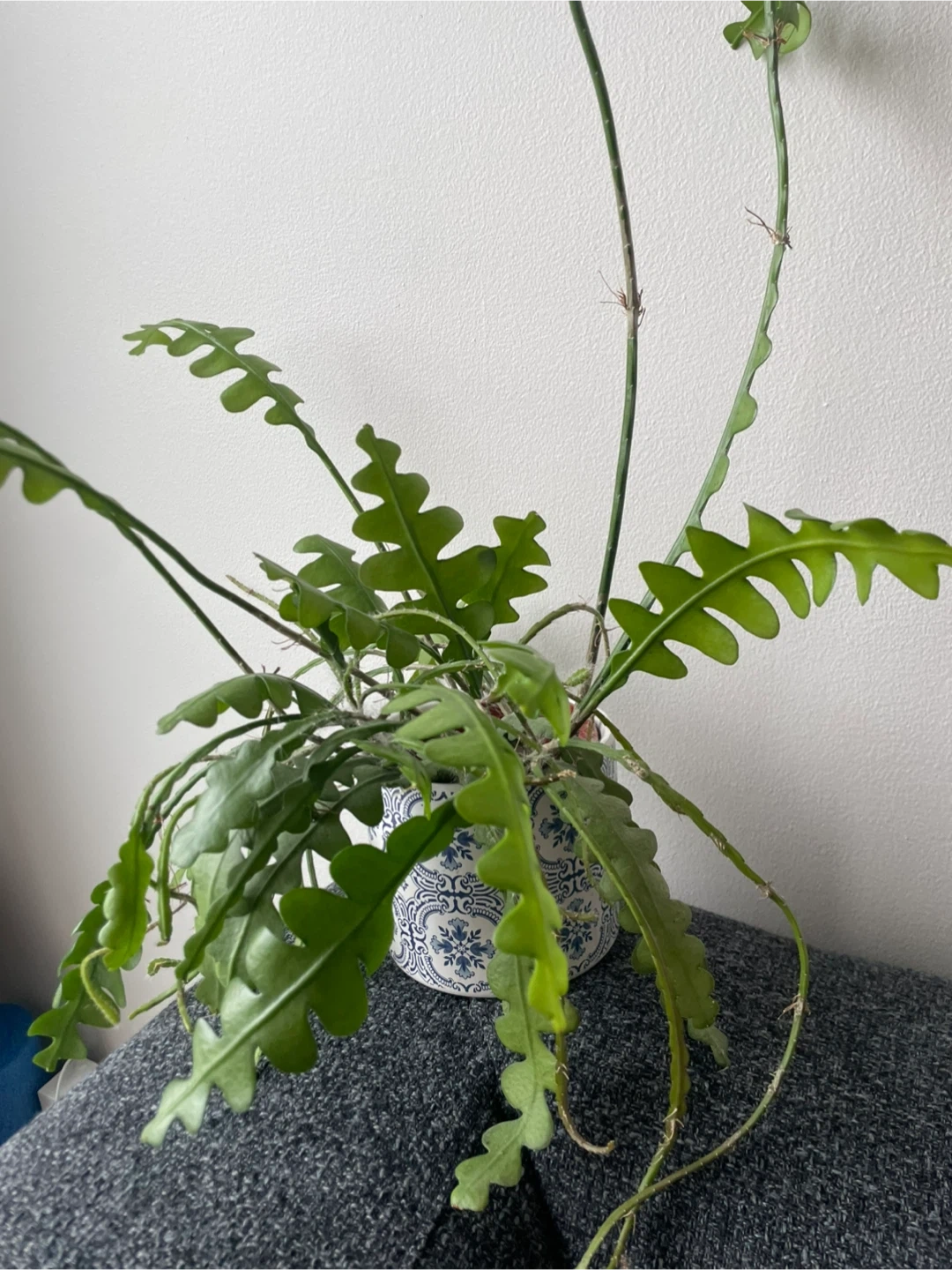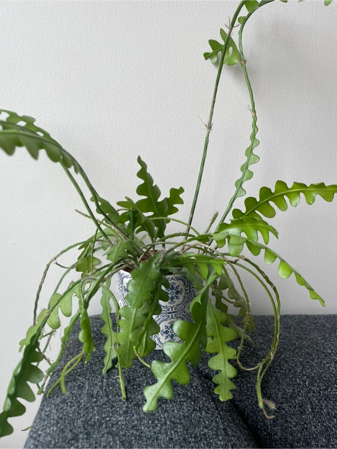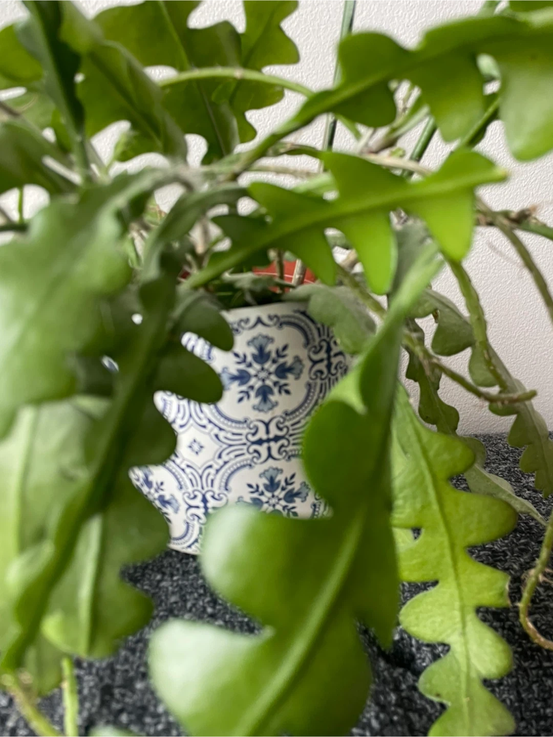 Selling a Epiphyllum Anguliger, also known as a Fishbone Cactus! It comes in a beautiful blue and white patterned pot.