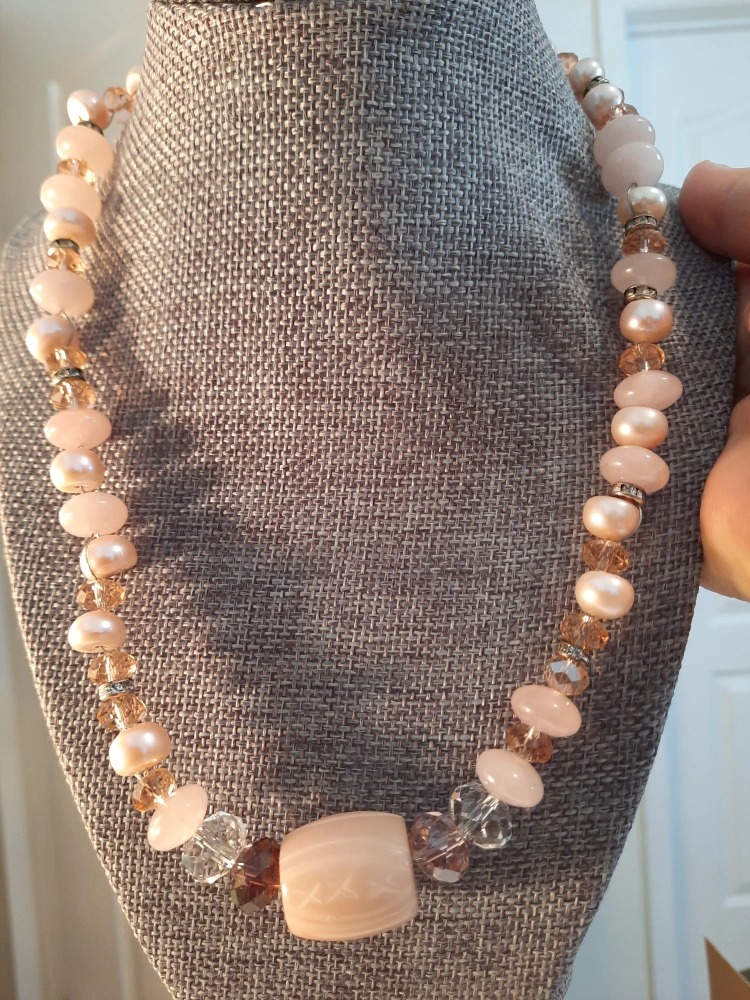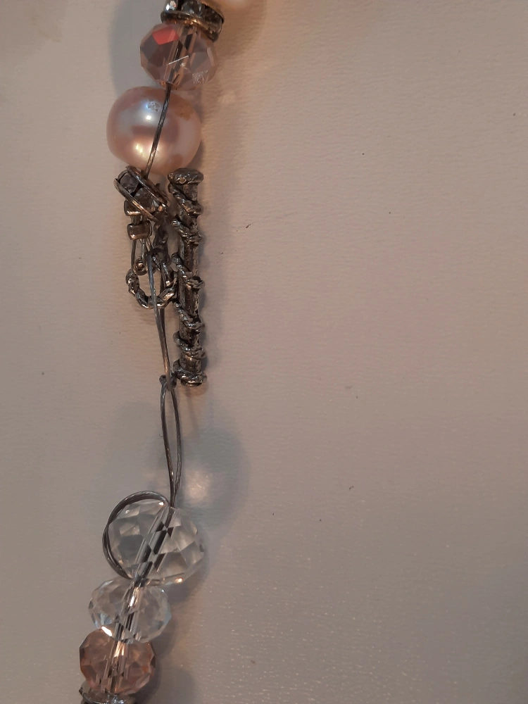 Beautiful handmade necklace featuring pink pearlsreal pearls , rose quartz, and crystal beads. It's a unique piece that would add a touch of elegance to any outfit