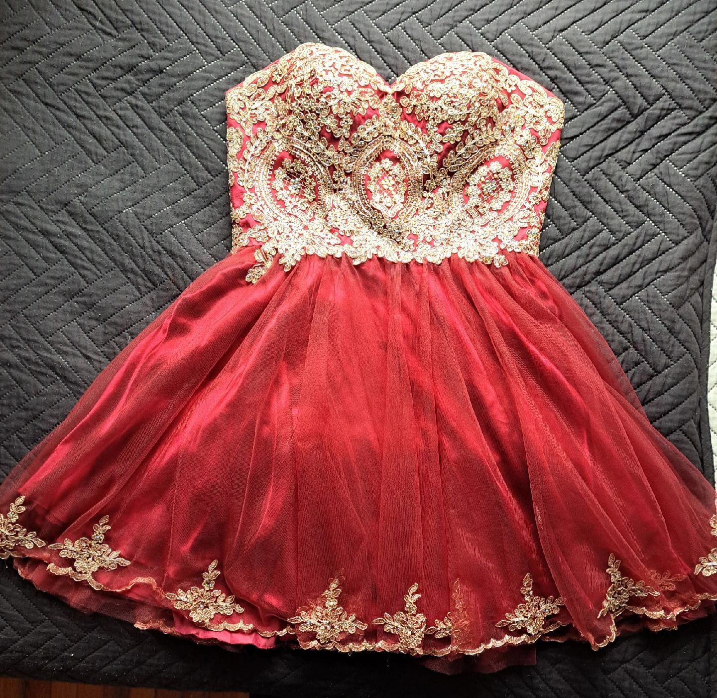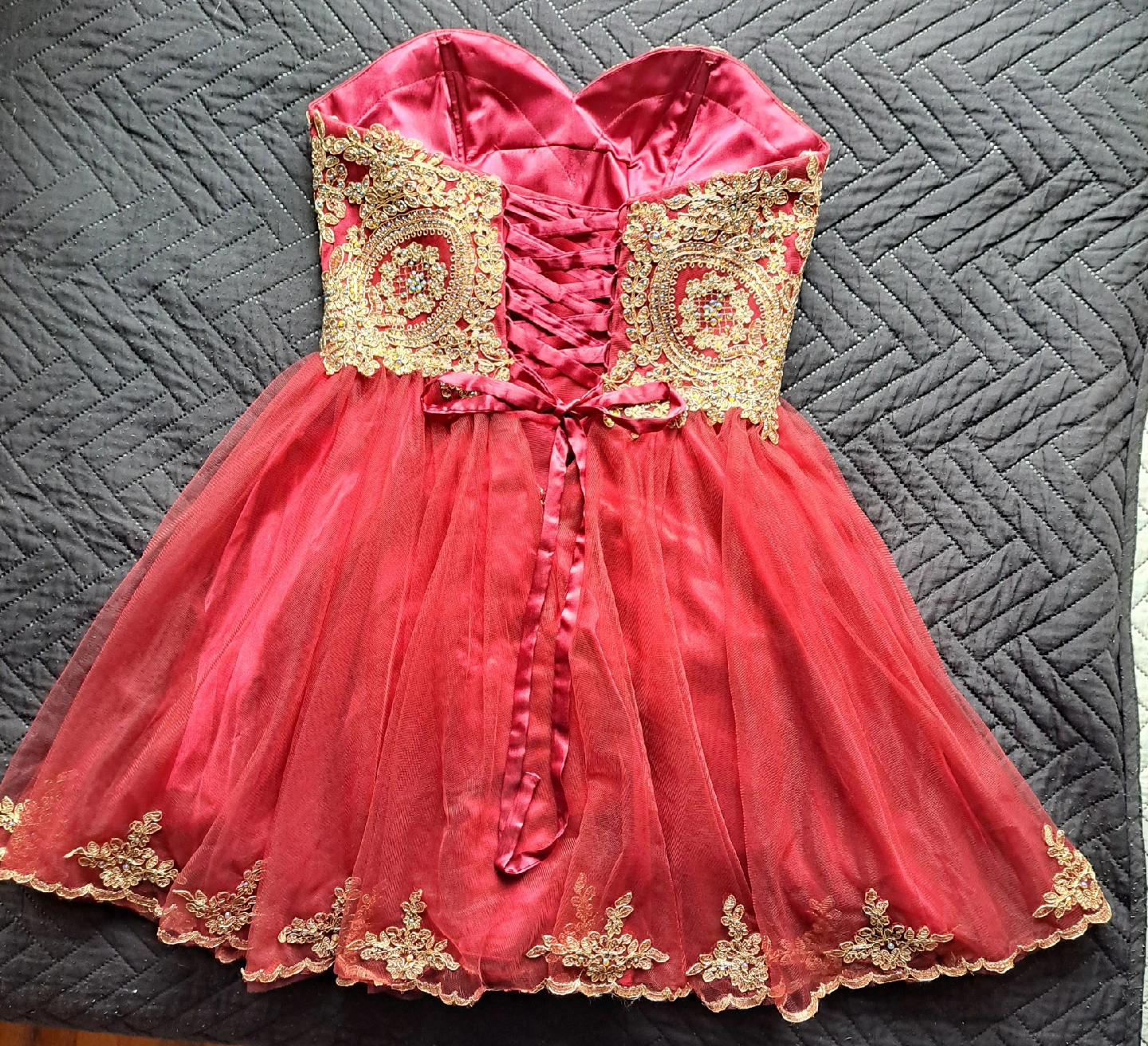 81Vestido corto strapless, color borgoña con apliques en la parte de arriba y en la parte de la falda, talla 8