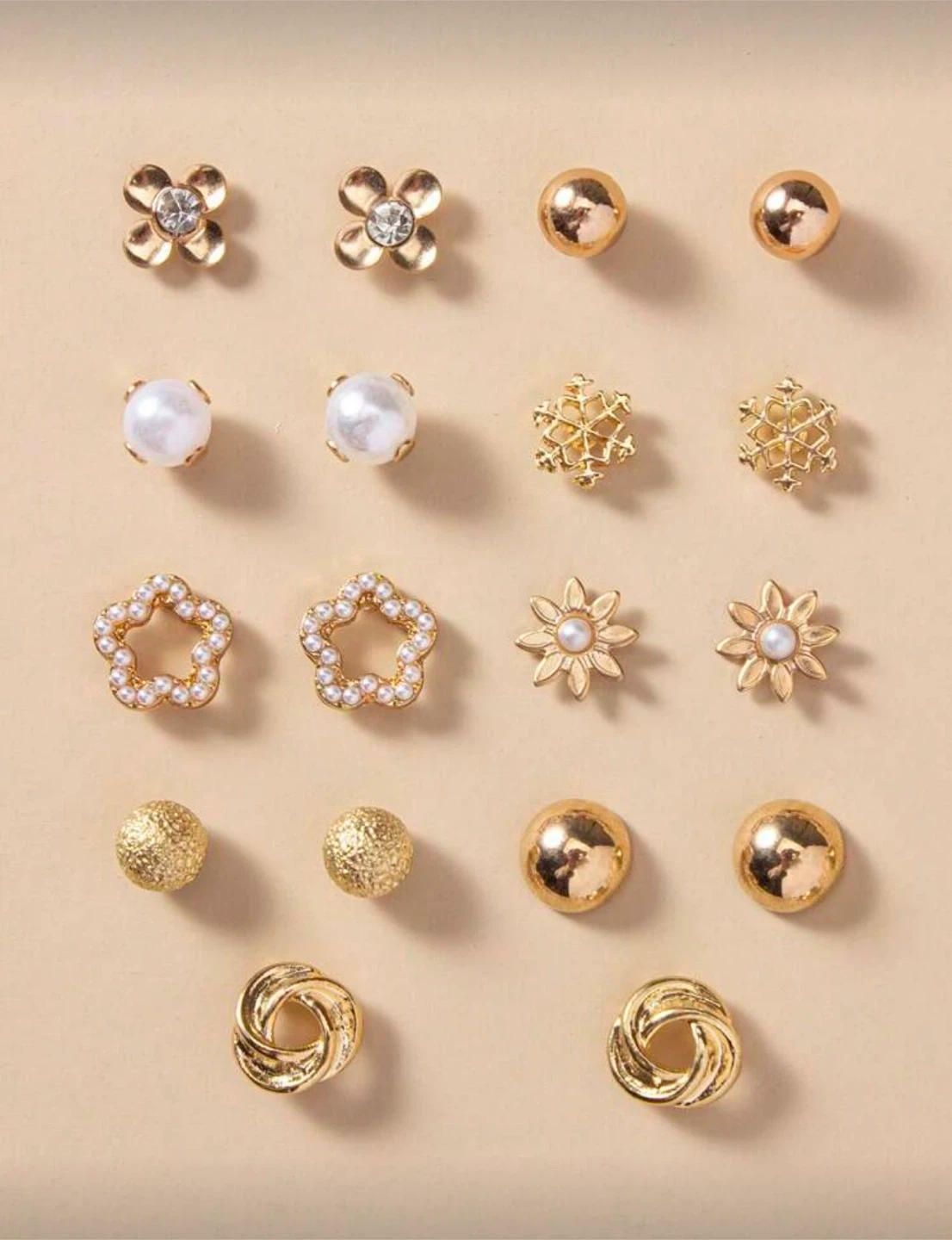 Selling a set of fashion earrings in a gold tone. This set includes a variety of stud designs, including floral, pearl, and geometric shapes. Perfect for adding a touch of elegance to any outfit!