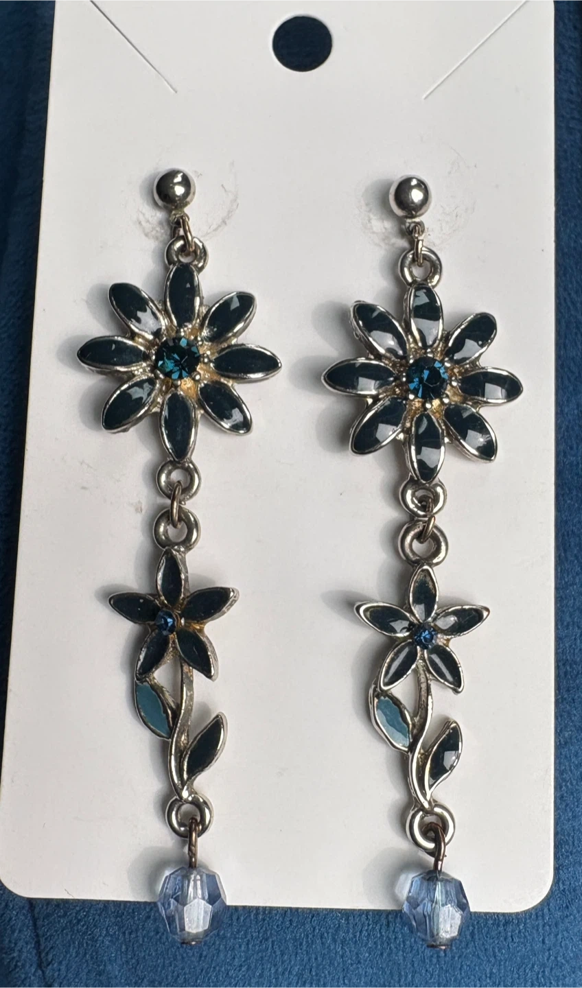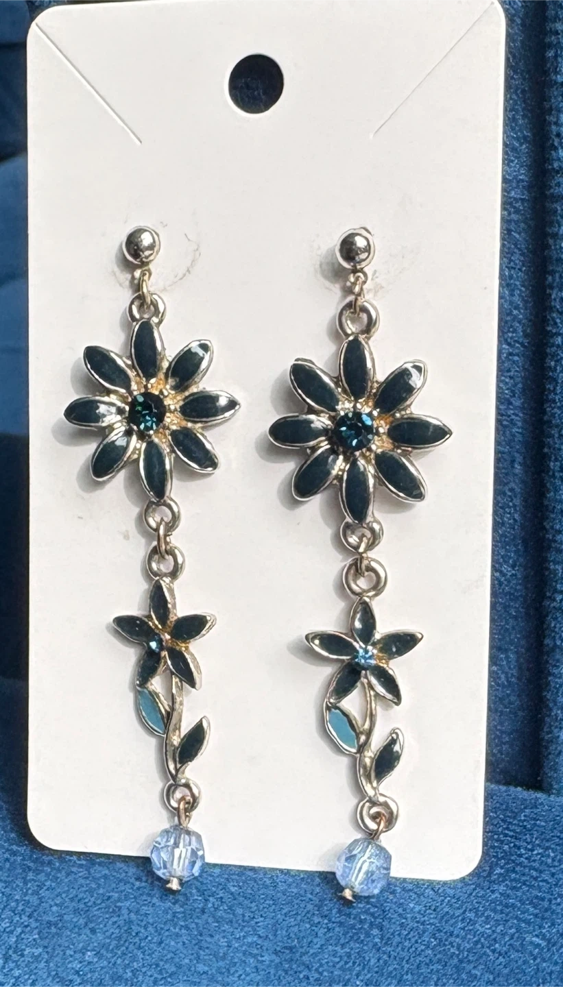 Cute flower drop earrings with blue accents! These would be a lovely addition to any outfit. The flower design is really eye-catching.