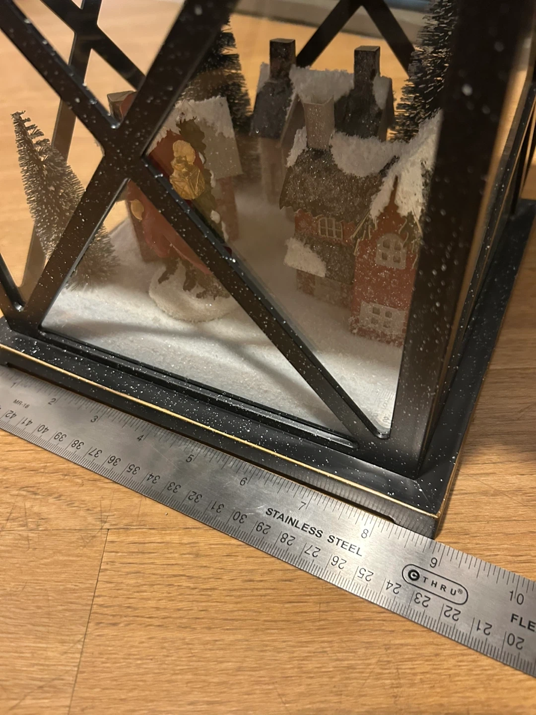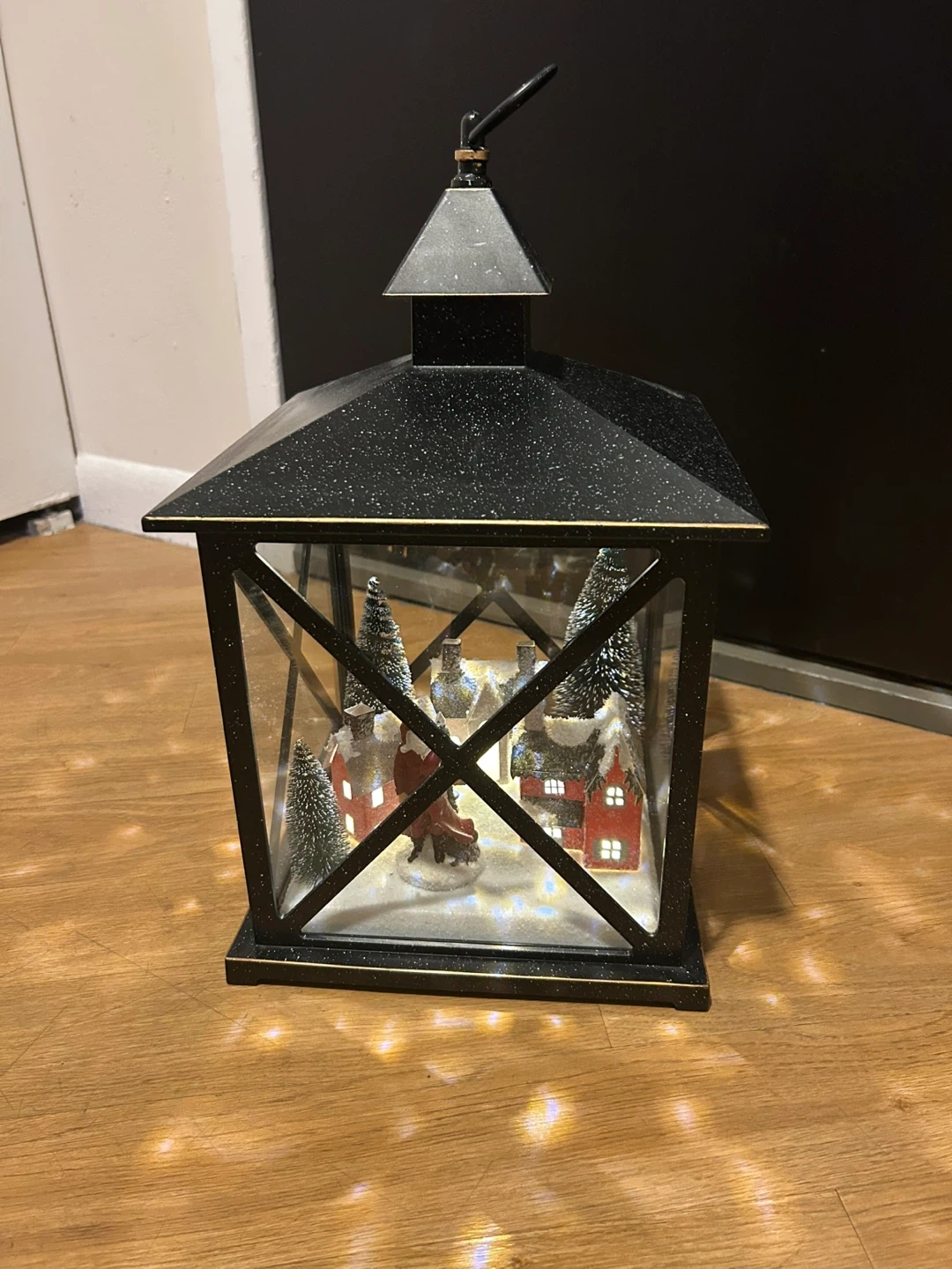 Selling a charming black Christmas village lantern! It's in great condition and creates a cozy holiday atmosphere. The lantern features a detailed miniature village scene inside, complete with snow-covered houses and trees. It measures approximately 15 inches in height and 9 inches in width, making it a lovely centerpiece or accent piece for your holiday decor. Works! Takes AAA batteries.