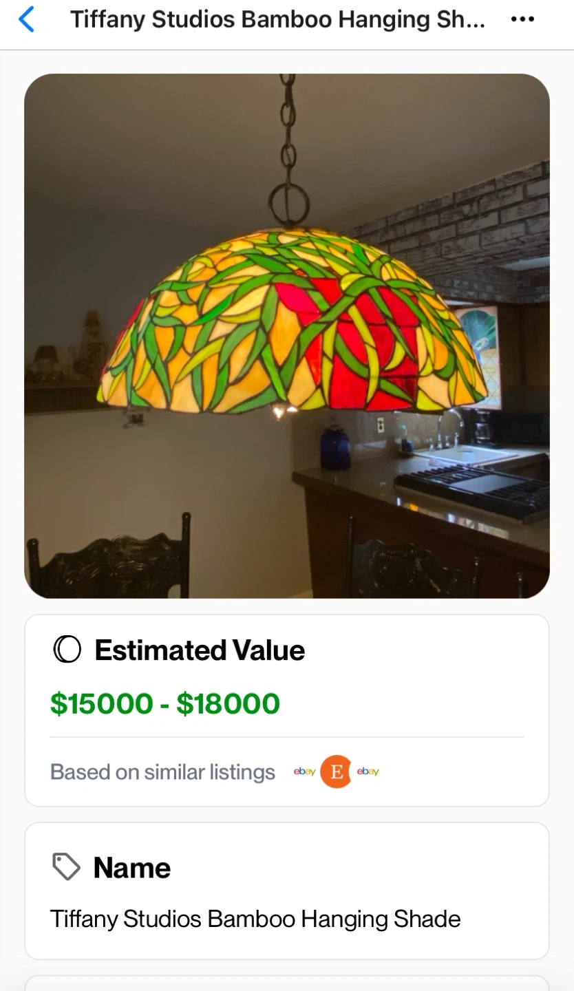 Selling a Tiffany Studios Bamboo Hanging Shade. Estimated value is between $15000 and $18000 based on similar listings