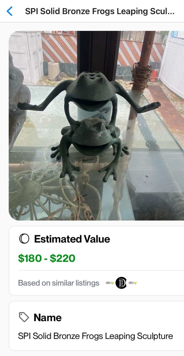 Selling an SPI Solid Bronze Frogs Leaping Sculpture. It's a charming piece with an estimated value between $180 and $220 based on similar listings