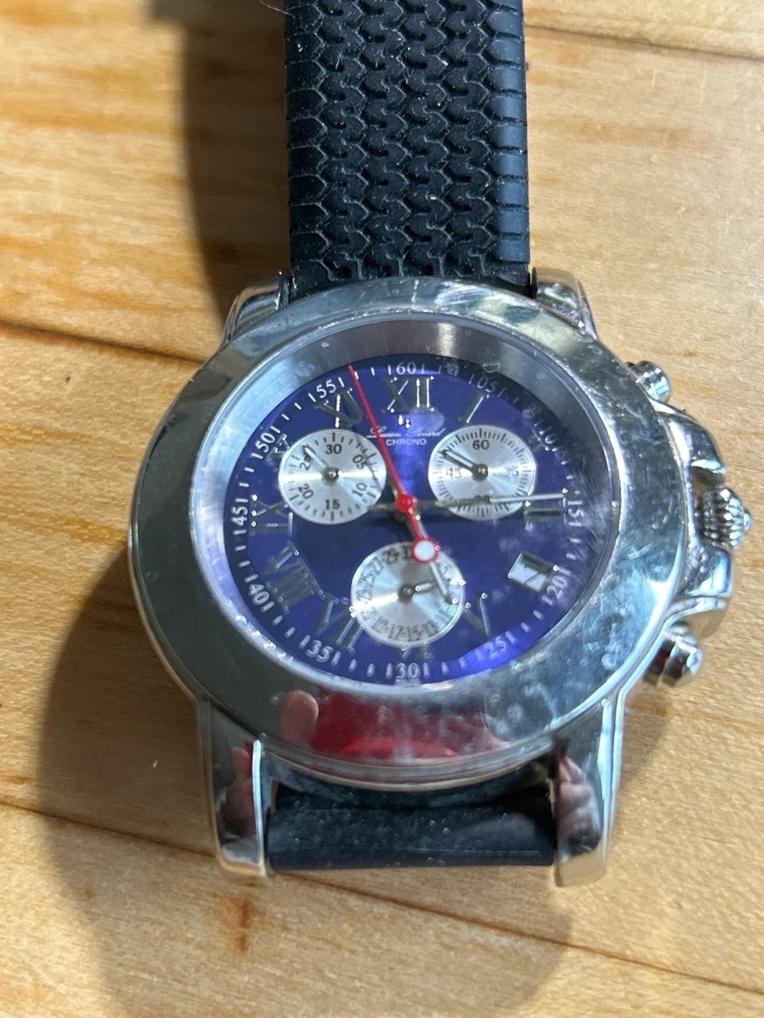Selling a Lucien Piccard Swiss made chronograph watch with a blue face and black band. It has some signs of wear, as seen in the pictures, but is still a stylish timepiece!