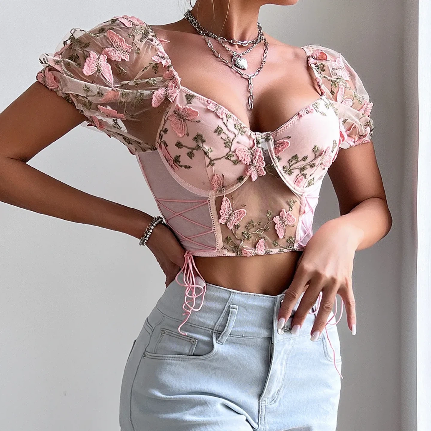 This is a super cute pink mesh corset top with butterfly embroidery! It's perfect for a night out or a special occasion.