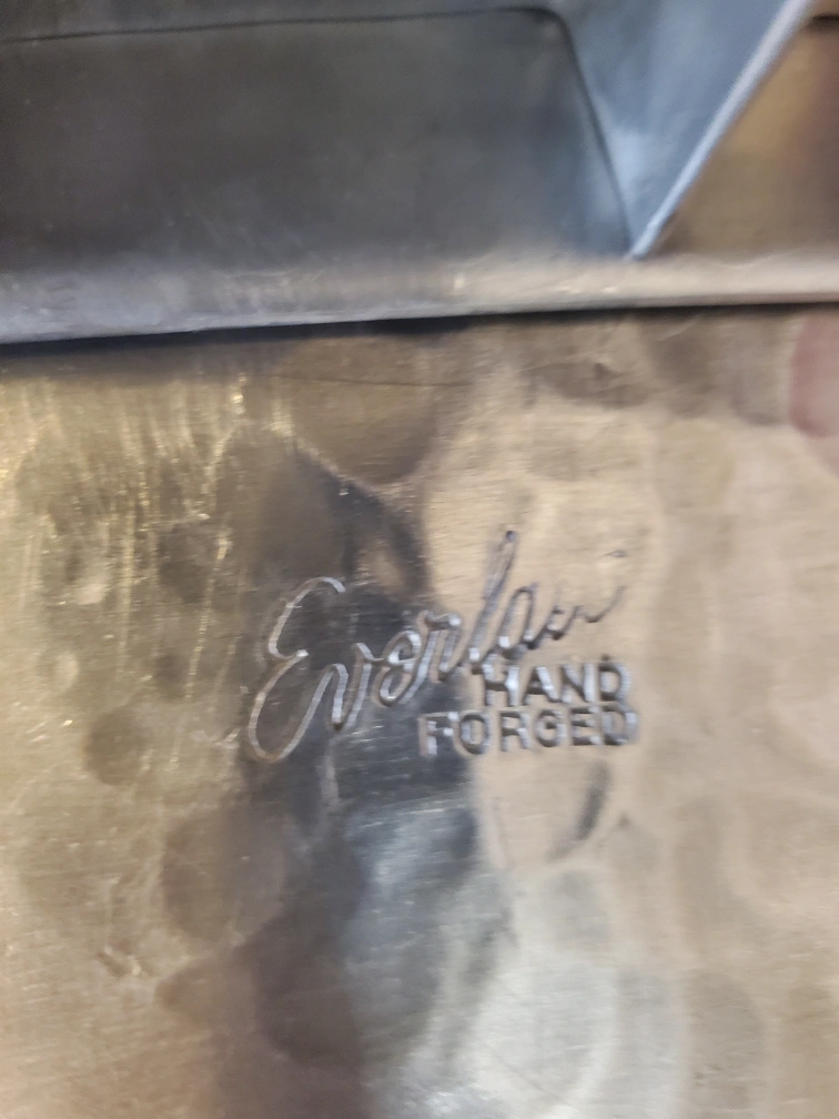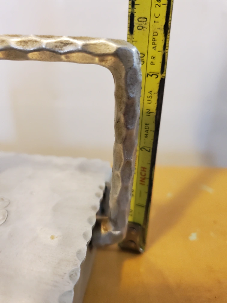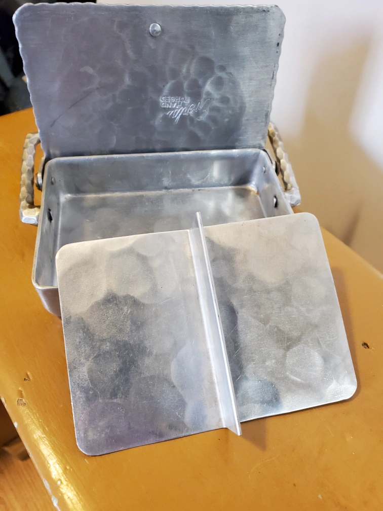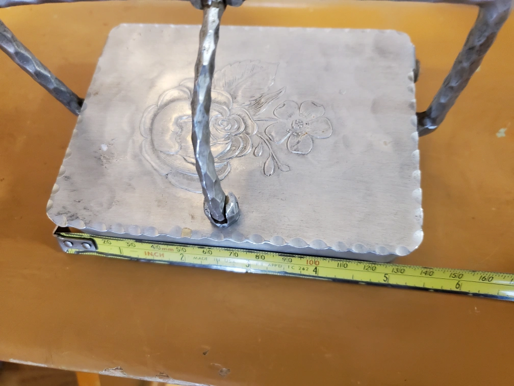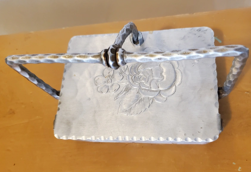 Selling a hand-forged aluminum metal box. It has a unique hammered texture and a floral design on the lid. It measures approximately 6 inches across.